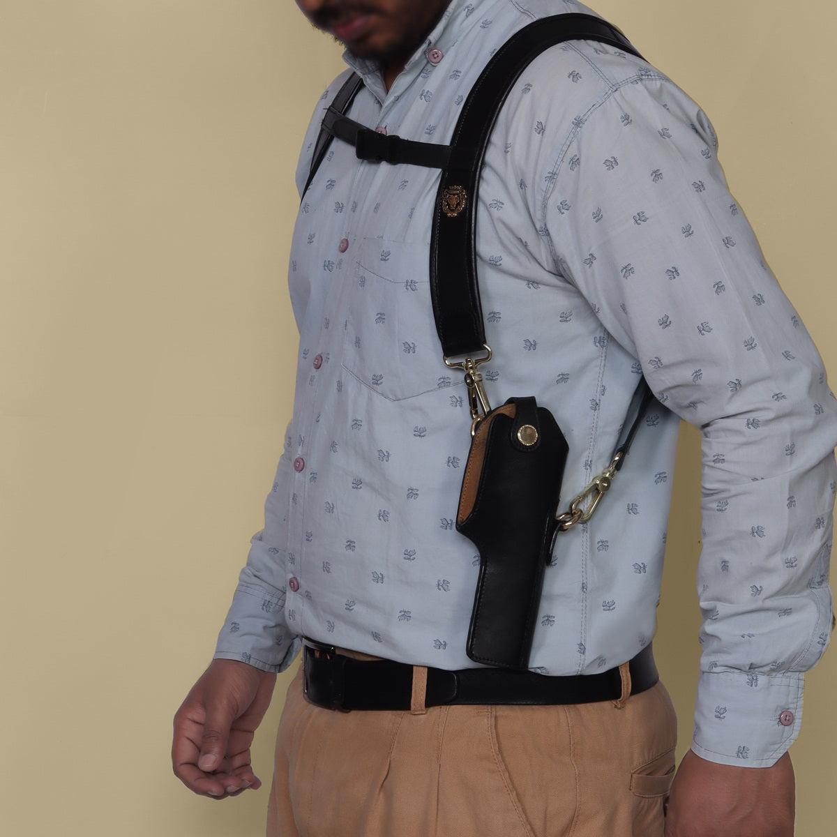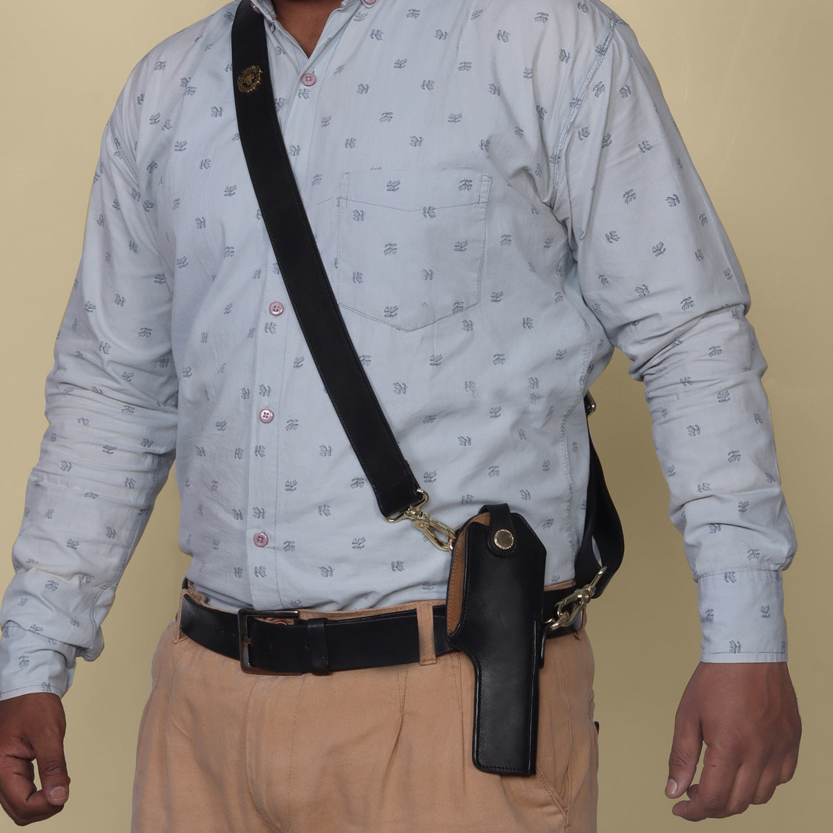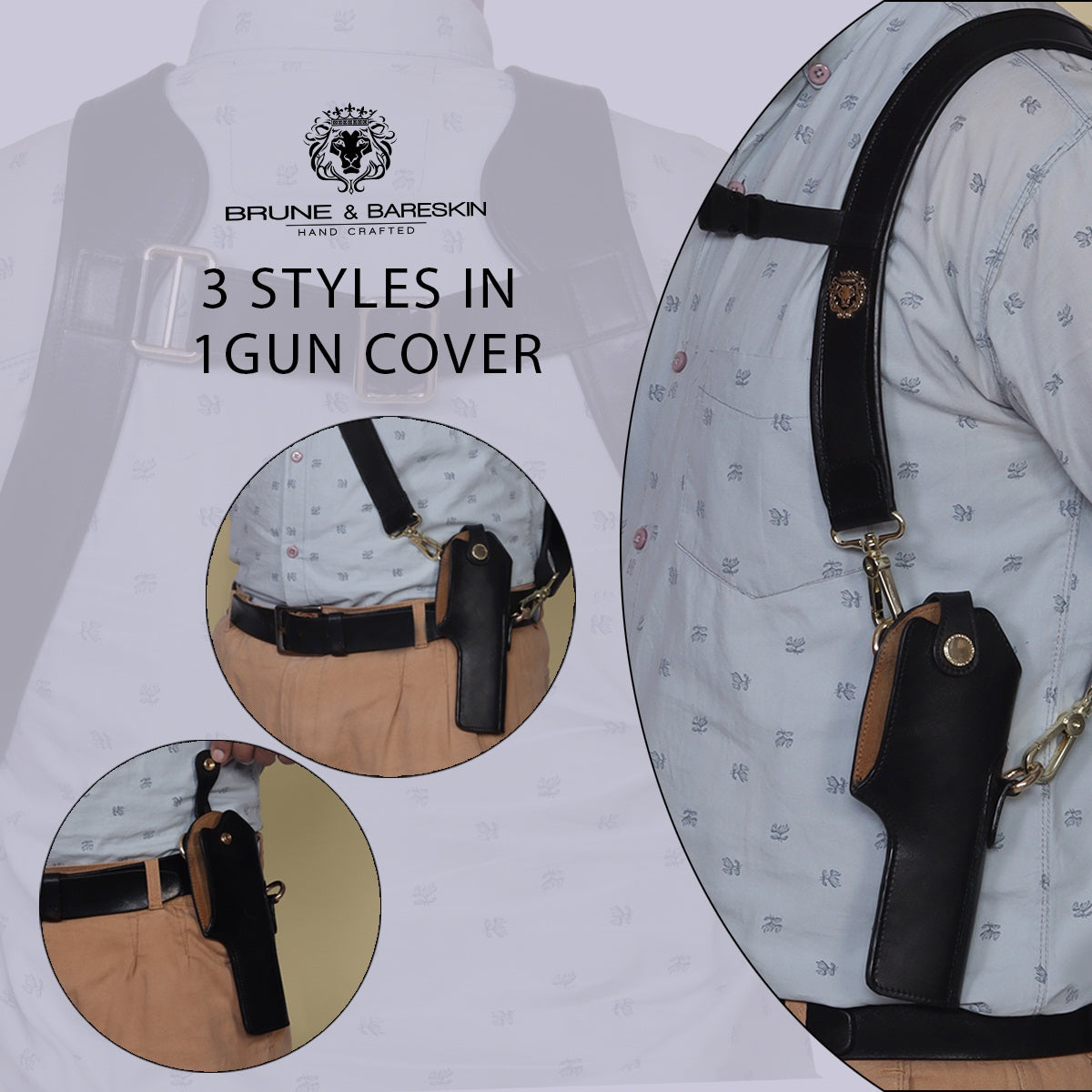 Introducing the Triple-Style-Carry in Black Genuine Leather! Crafted precisely for .30 bore pistols. it offers three style options: on the belt, cross body, and across shoulders. It can be made to order for any weapon you need. Enjoy the convenience and luxury of carrying your ammo in style!