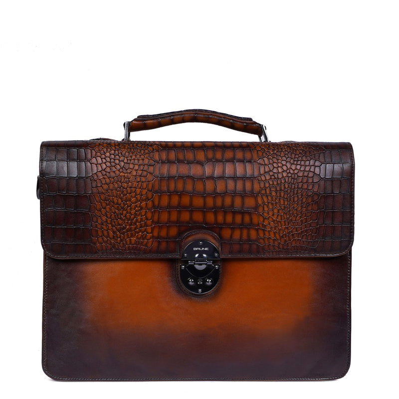 Black Deep Cut Croco Leather Laptop Briefcase