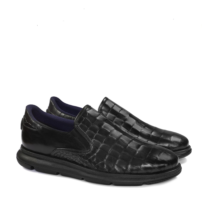 Get ready for ultimate comfort and style with these Brune & Bareskin low top black sneakers. Handmade with premium quality materials, these ultra-lightweight sneakers are not only stylish but also extra comfortable. Featuring a weaved leather vamp and croco textured shoe collar, these sneakers are perfect for any casual outfit. Plus, the subtle embossed lion logo and cushioned foot-bed add a touch of luxury. With an anti-skid patterned rubber sole, these sneakers are perfect for any activity.