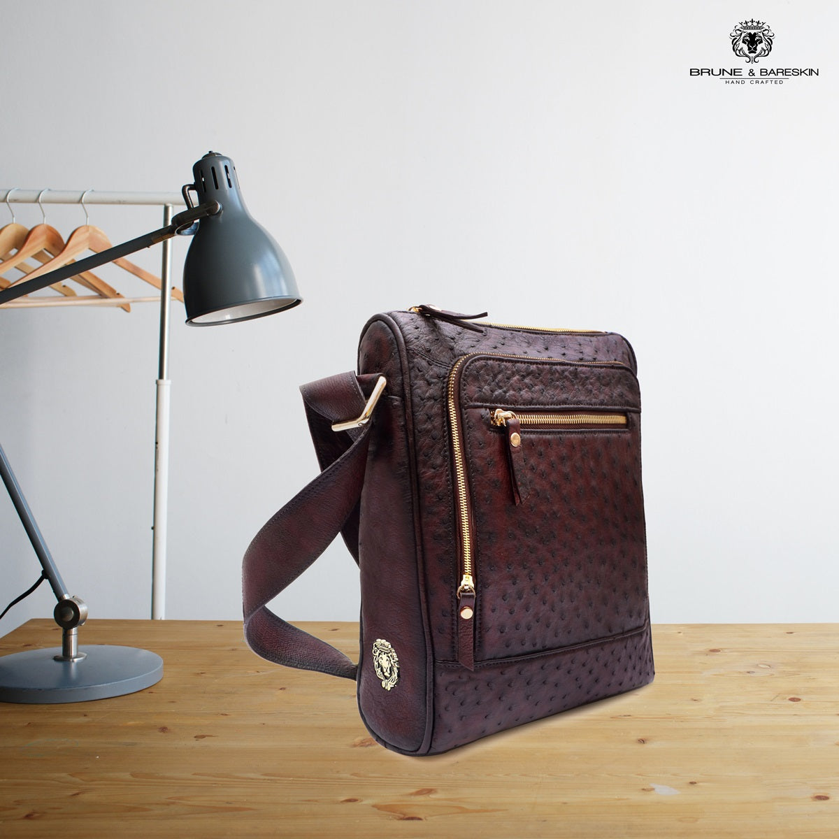 This special Ostrich leather Cross-body Bag is made to give you a completely elegant look. The quality of the leather Bag ranks high on durability and style factors. This Dark Brown Ostrich leather Cross-body Bag looks very elegant. The BRUNE & BARESKIN signature metal Lion brand logo increases the style quotient. This bag is quite very handy for the traveler's as well. It provides the easy access to the needy essentials. Stylish look makes it an eye catching accessory. This cross body city bag for the modern entrepreneur, stylish in appearance with its veg Browned Real Ostrich leather its gonna be an eye stopper. 100% pure ostrich leather is used for making your style. When you choose branded by BRUNE & BARESKIN, you are sure to get more than a few glances coming your way.