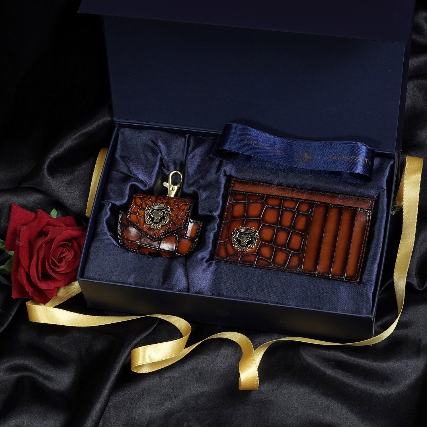This Smokey Finish Combo of Tan Card Holder & Air-Pod Cover by Brune & Bareskin Brand is the perfect accessory. Made from premium leather with a patina finish and croco texture, this combo is stylish and durable. Embellished with a metal lion brand logo, it makes a perfect gift to anyone who appreciates quality craftsmanship.