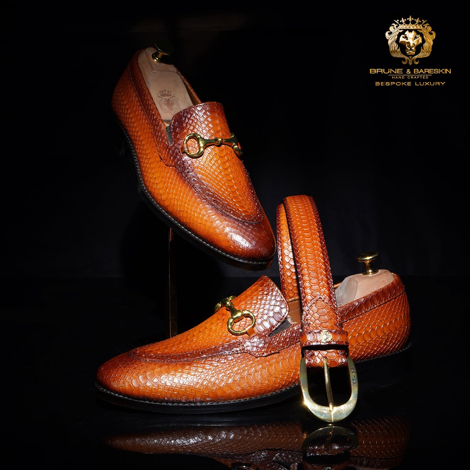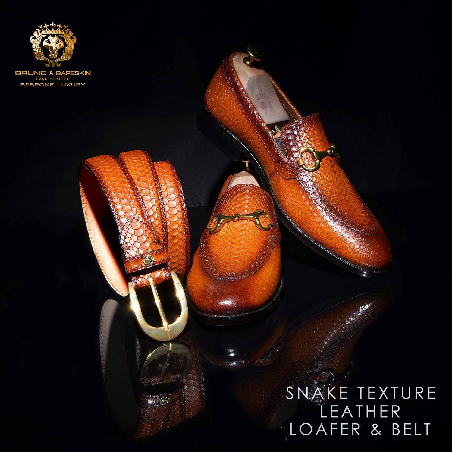 Step out in style with this perfect gentleman combo of loafers and belt by Brune & Bareskin. Made with premium quality, hand-crafted snake skin textured leather in a sleek tan color, it features a mini metal lion logo and an apron toe design. The leather sole and extra cushioning ensure comfort and durability. Complete your look with this stylish combo!