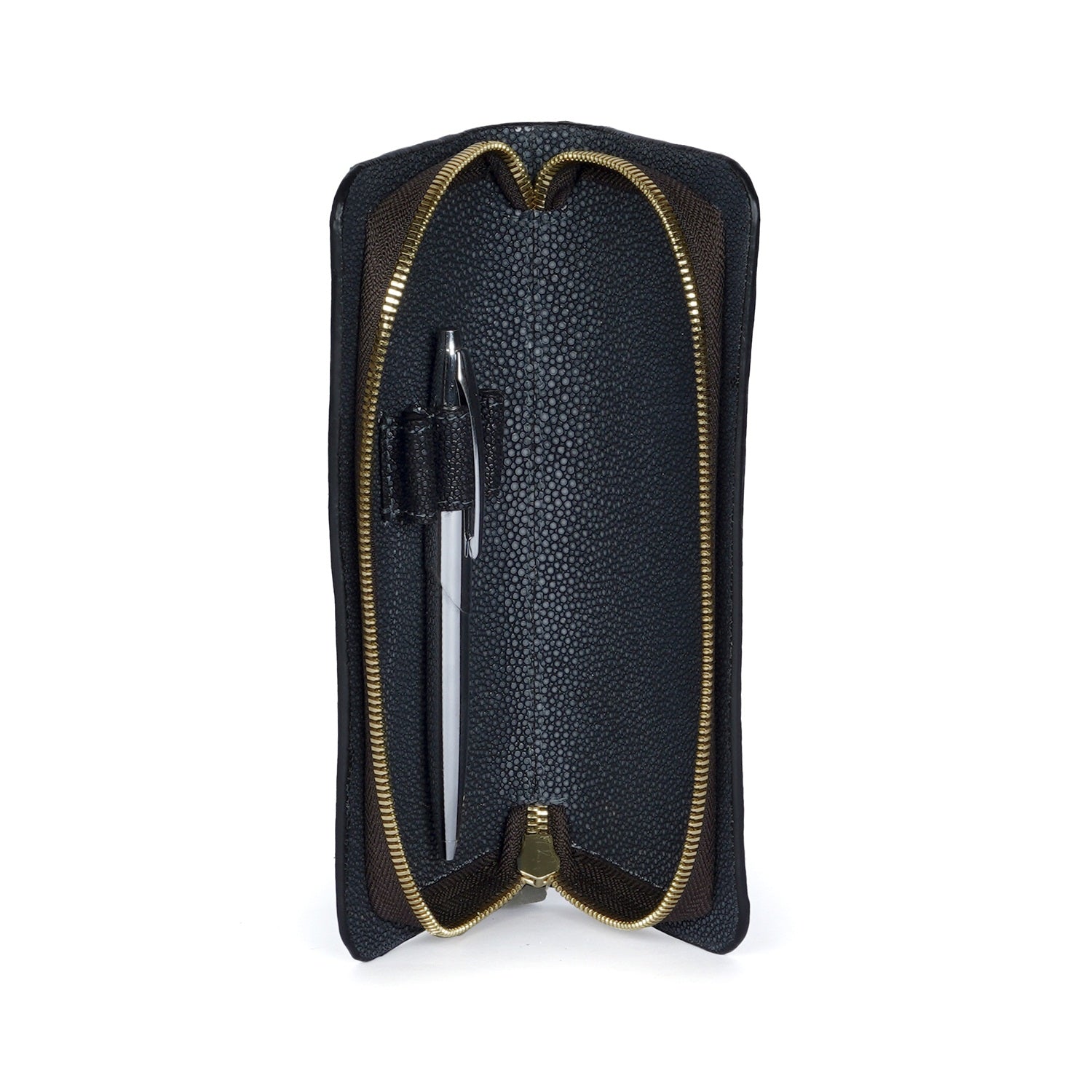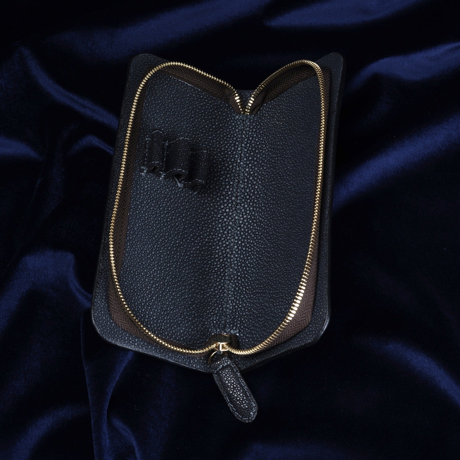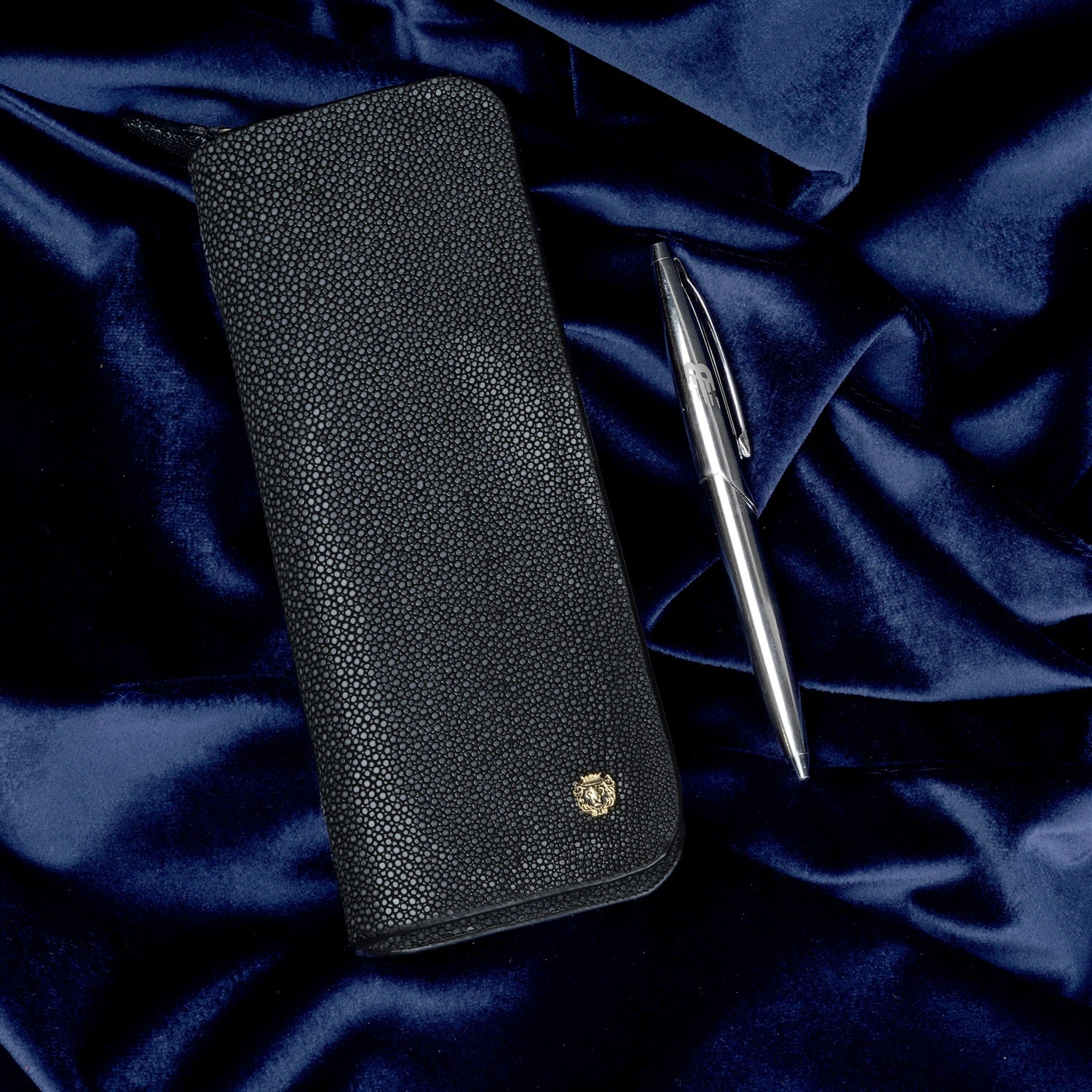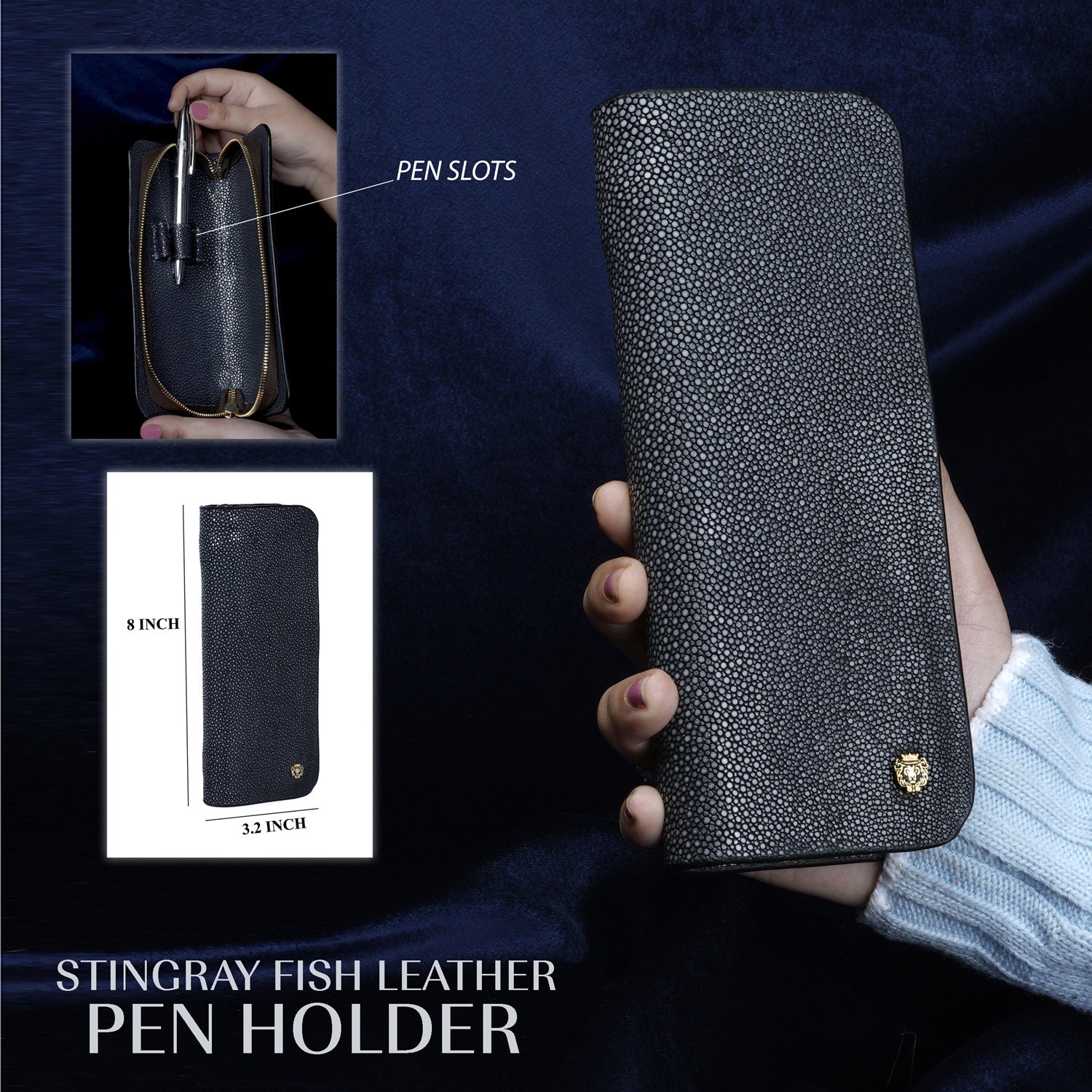Experience luxury travel with our Stingray Fish Leather Pen Holder! Made from exotic and highly durable stingray fish leatherby Brune & Bareskin, this water and scratch resistant accessory is perfect for organizing your pens. The mini metal lion logo adds an eye-catching touch to this premium quality holder with a natural shine. Zip up the gray, brand new holder and elevate your travel style.