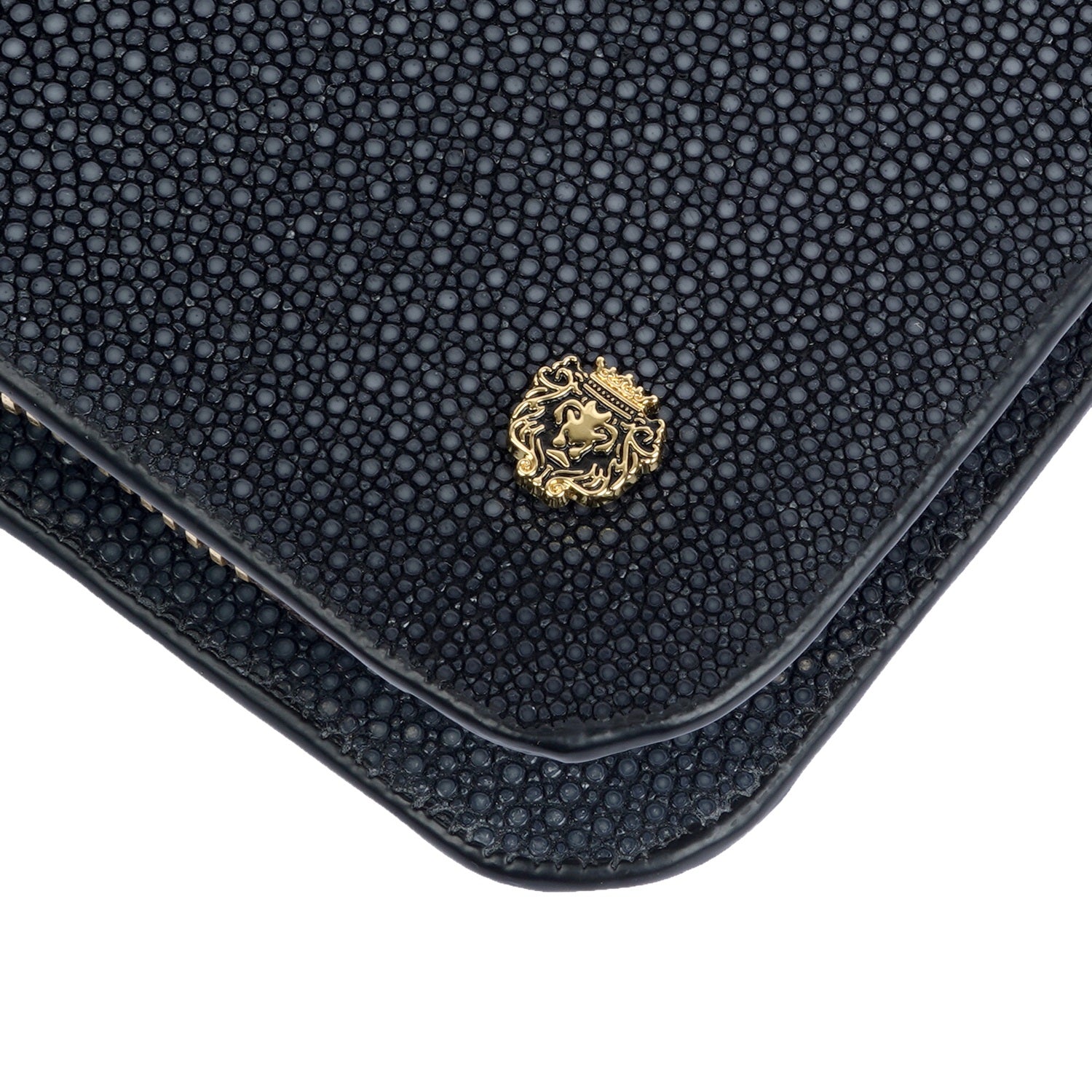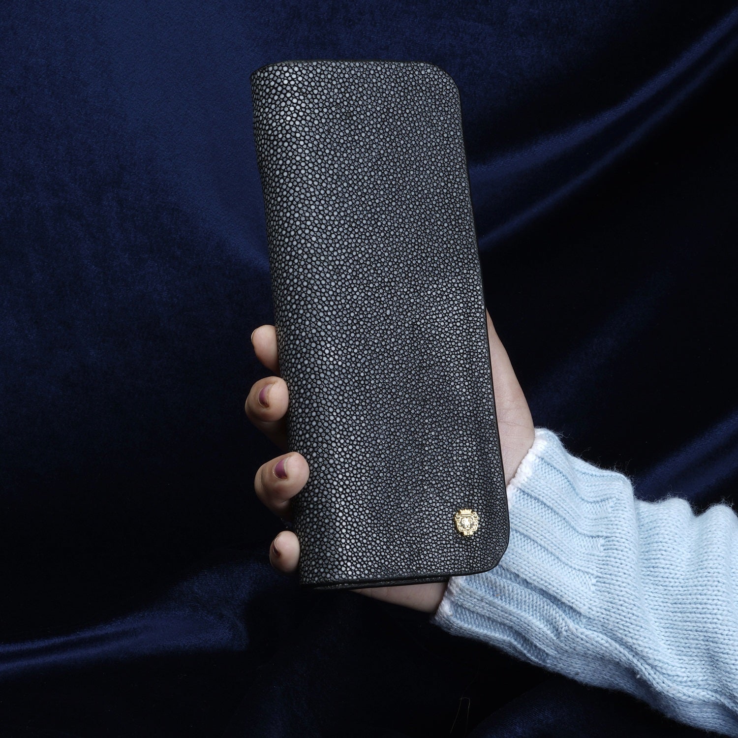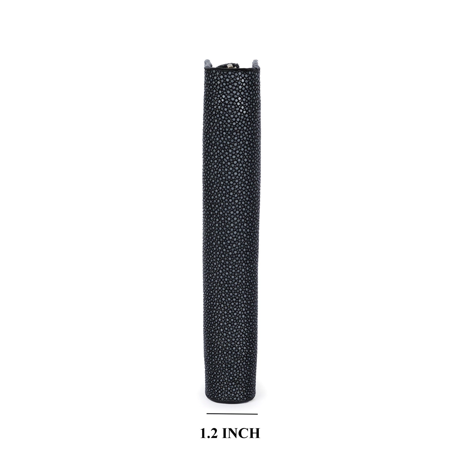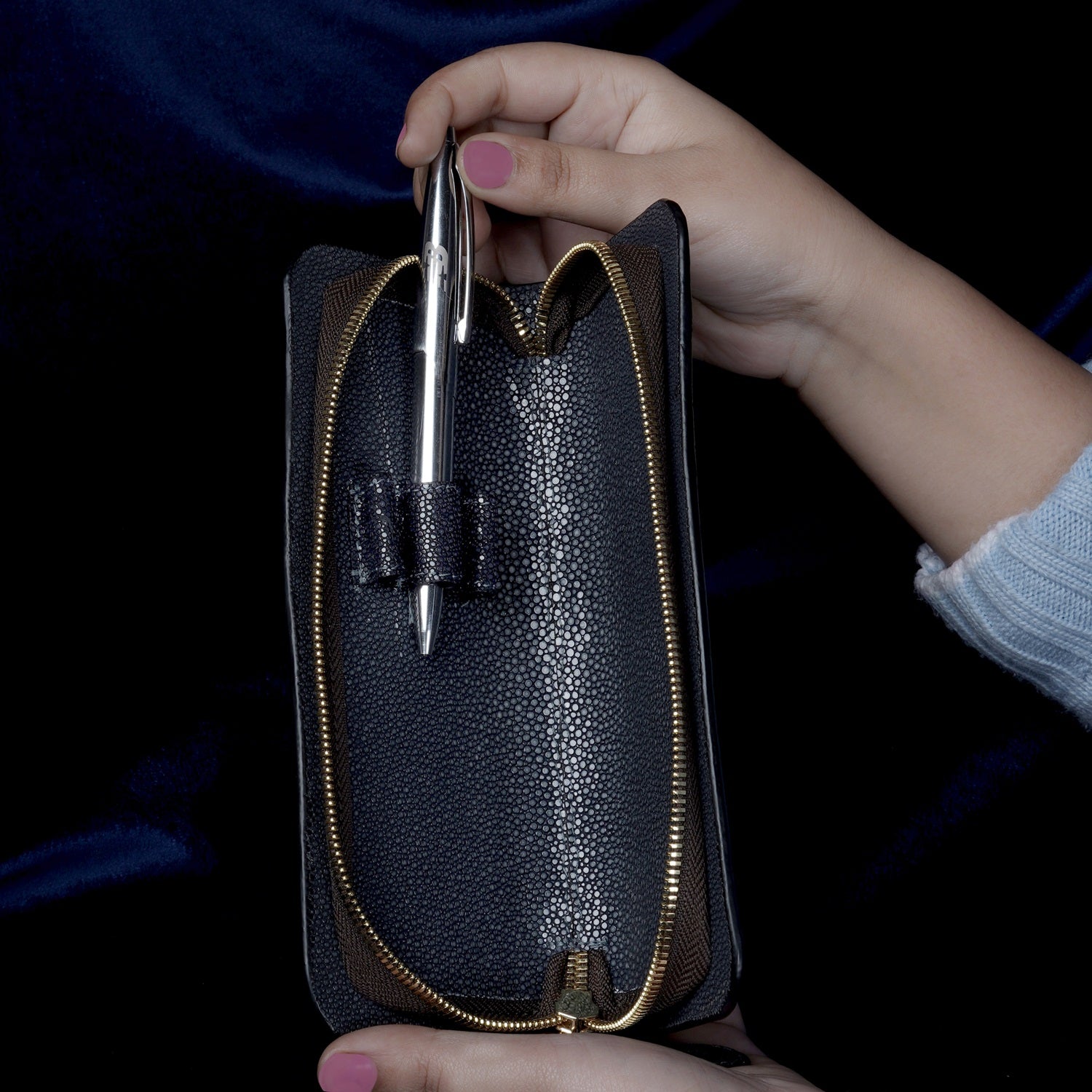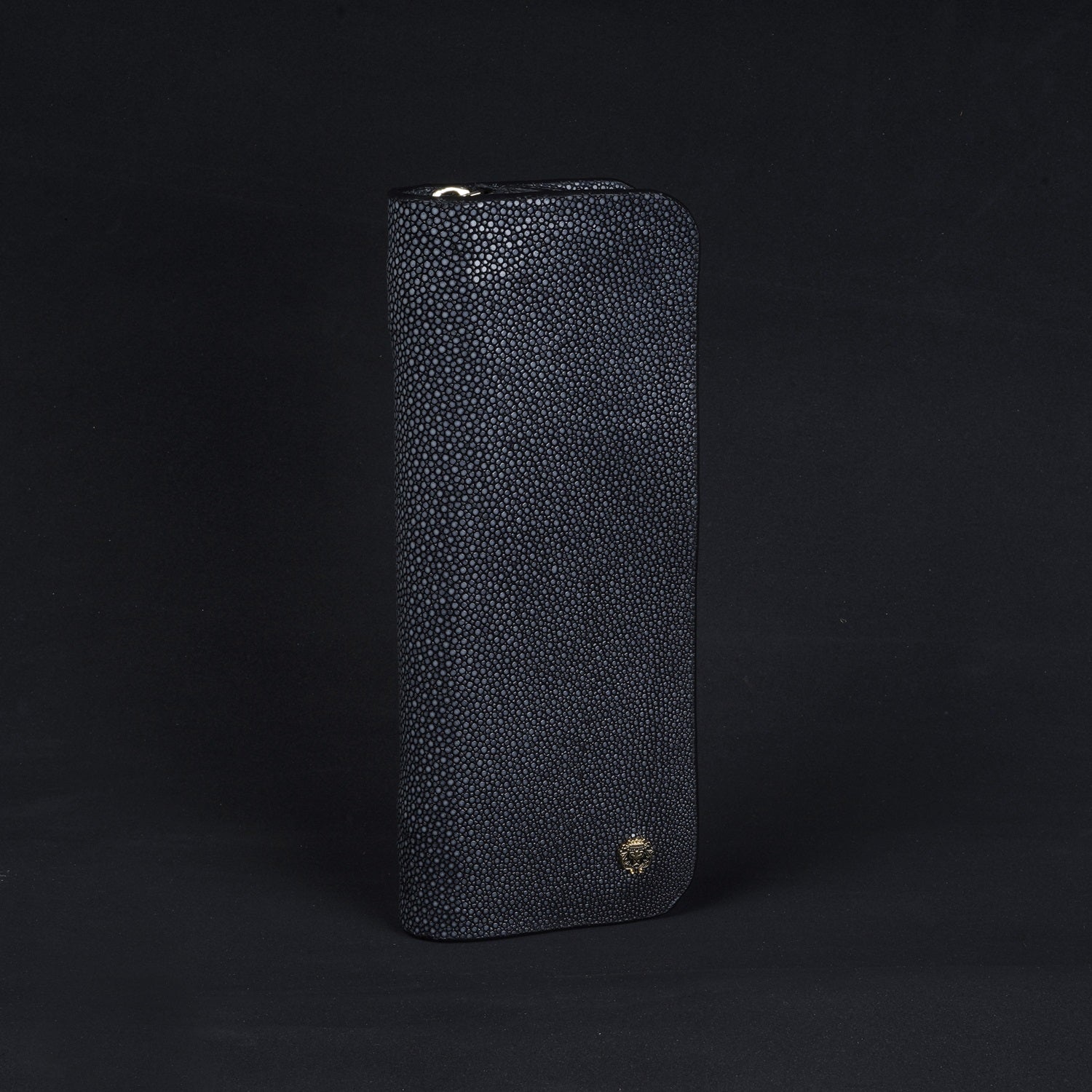 Experience luxury travel with our Stingray Fish Leather Pen Holder! Made from exotic and highly durable stingray fish leatherby Brune & Bareskin, this water and scratch resistant accessory is perfect for organizing your pens. The mini metal lion logo adds an eye-catching touch to this premium quality holder with a natural shine. Zip up the gray, brand new holder and elevate your travel style.
