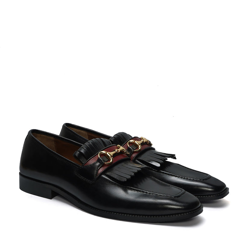 Get ready to impress with these stylish Tan Formal Slip-On Shoes from Brune & Bareskin. The perfect combination of fringes and Horse-bit buckle detailing on the toe will add a touch of sophistication to your outfit. Made with premium quality genuine leather and featuring a sleek Italian toe, these shoes offer a classic formal look. The contrasting green leather trim on the backside of the buckle adds a unique touch to these men's slip-on shoes, making them perfect for both formal occasions and the office.