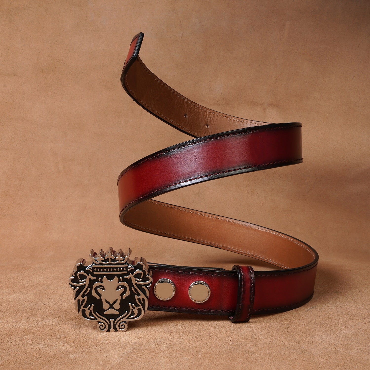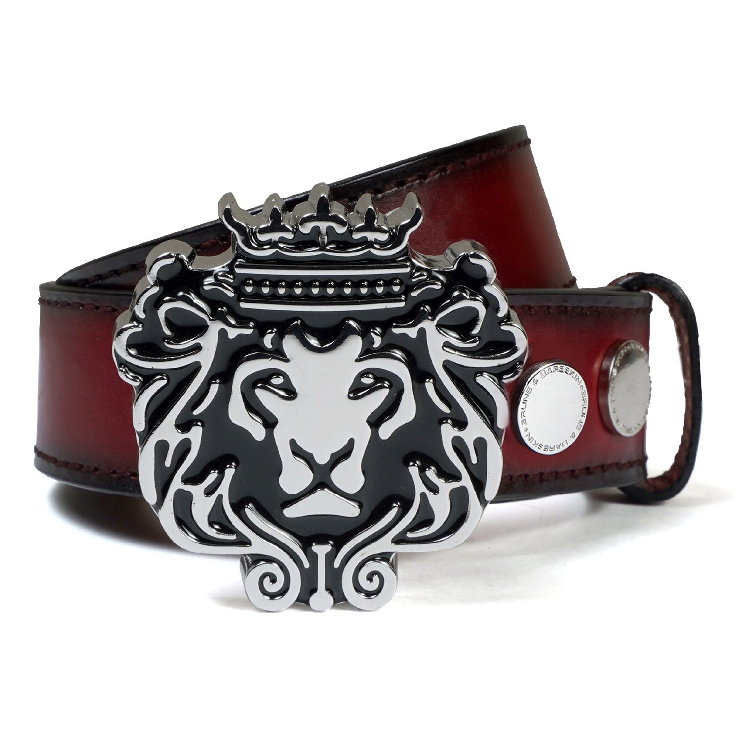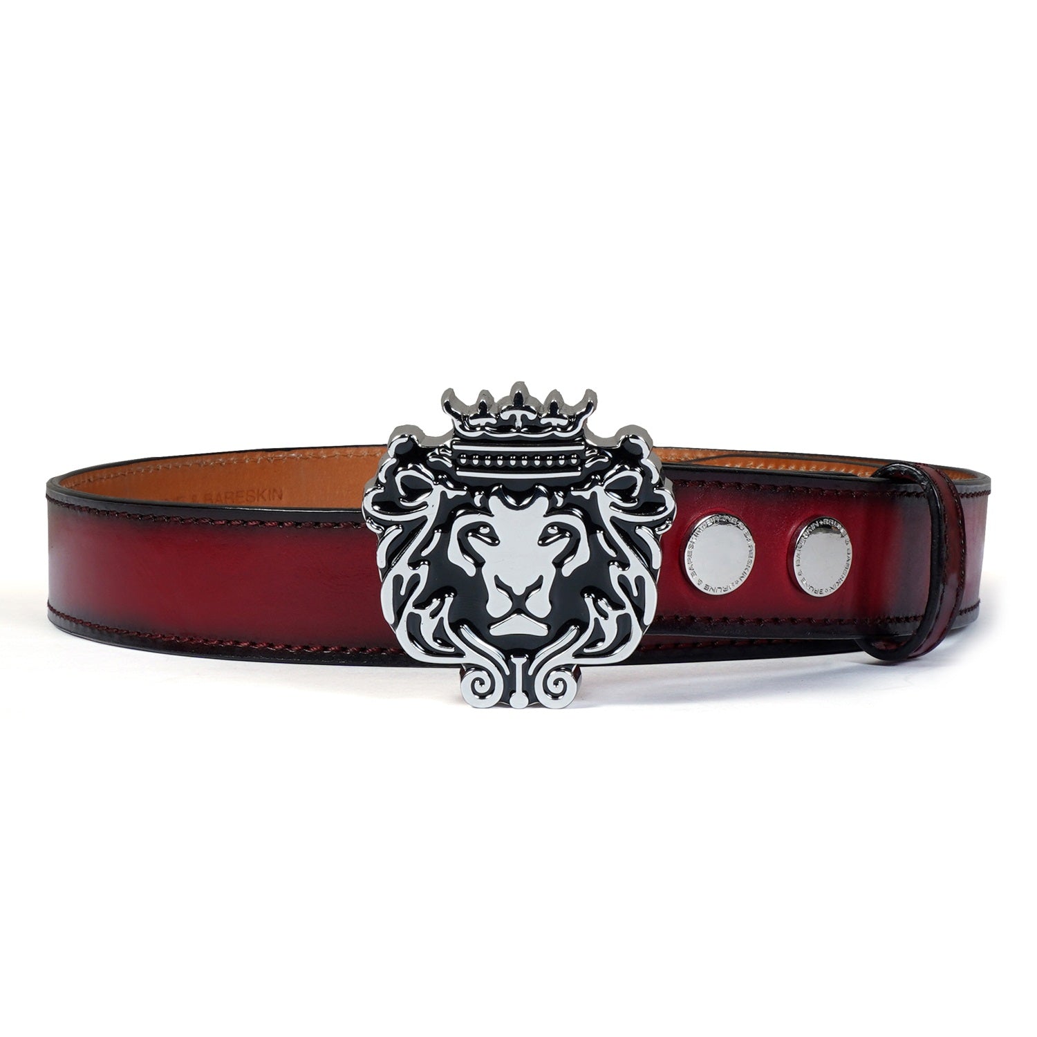 Add a touch of luxury to your look with the Trademark Logo Buckle Belt in wine genuine leather by Brune & Bareskin. This belt features a signature lion brand logo buckle and premium thick silver metal buckle that adds extra weight and quality. The burnished wine genuine leather strap is removable and can be easily changed to match your outfit, while the convenient snap buttons opening makes this belt both stylish and functional. Elevate your style with this premium quality belt.