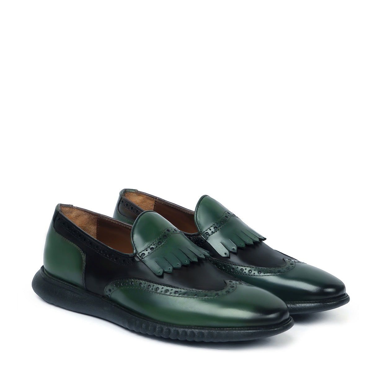 Dual Shade Light Weight Leather Loafer with Green-Dark Brown Wingtip Brogue Fringes