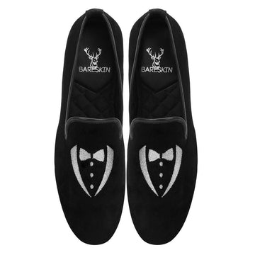 An elegant pair of black velvet slip on shoes with Tuxedo Collection in silver embroidery...