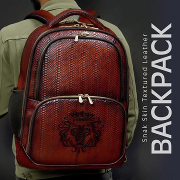 This snake skin-textured leather backpack combines luxury and practicality for professionals and travelers alike. Featuring...