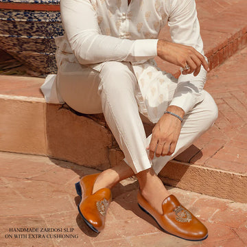 The hand-zardosi on Dark brown Italian leather looks astonishing. These ethnic slip-on shoes are made...