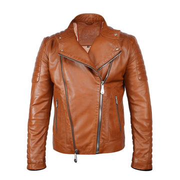 Crafted from premium lamb leather, this tan leather jacket blends timeless style with refined detailing....