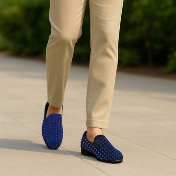 This elegant pair of Blue Arrowhead Stud on a Blue Velvet slip-on is a must-have...