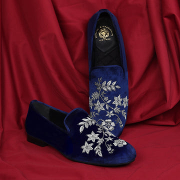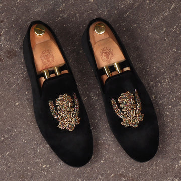 Step into luxury with our Rose Inspired Golden Zardosi Black Velvet Slip-Ons! Handcrafted with premium...