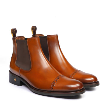 Crafted in rich tan leather, these boots showcase classic brogue punching detailing that adds depth...