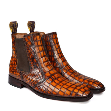 This high-ankle length tan deep cut croco leather boots can be customized to your liking....