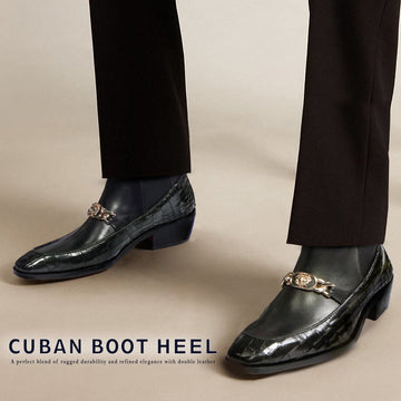 These black leather boots exude timeless elegance, featuring a sophisticated croco-textured base and smooth plain...