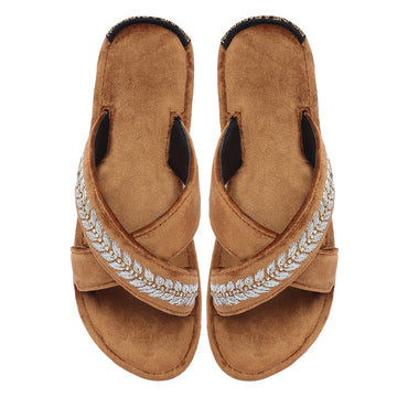 Tan Italian Velvet Cross strap sliders with Leaf zardosi are must have footwear in this...
