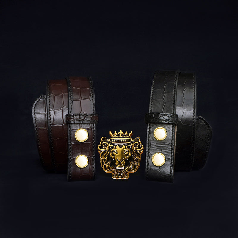 Elevate your style with the Trademark Lion Logo Golden Buckle Belt and 2 Leather Straps. The signature lion logo premium quality thick golden metal buckle add a touch of luxury, while the wine croco embossed textured and plain burnished leather offers a unique and timeless look. With convenient snap buttons and a removable belt strap, you can easily change up your look. Made with genuine deep cut croco textured leather from the renowned brand Brune & Bareskin, this belt exudes quality and sophistication.