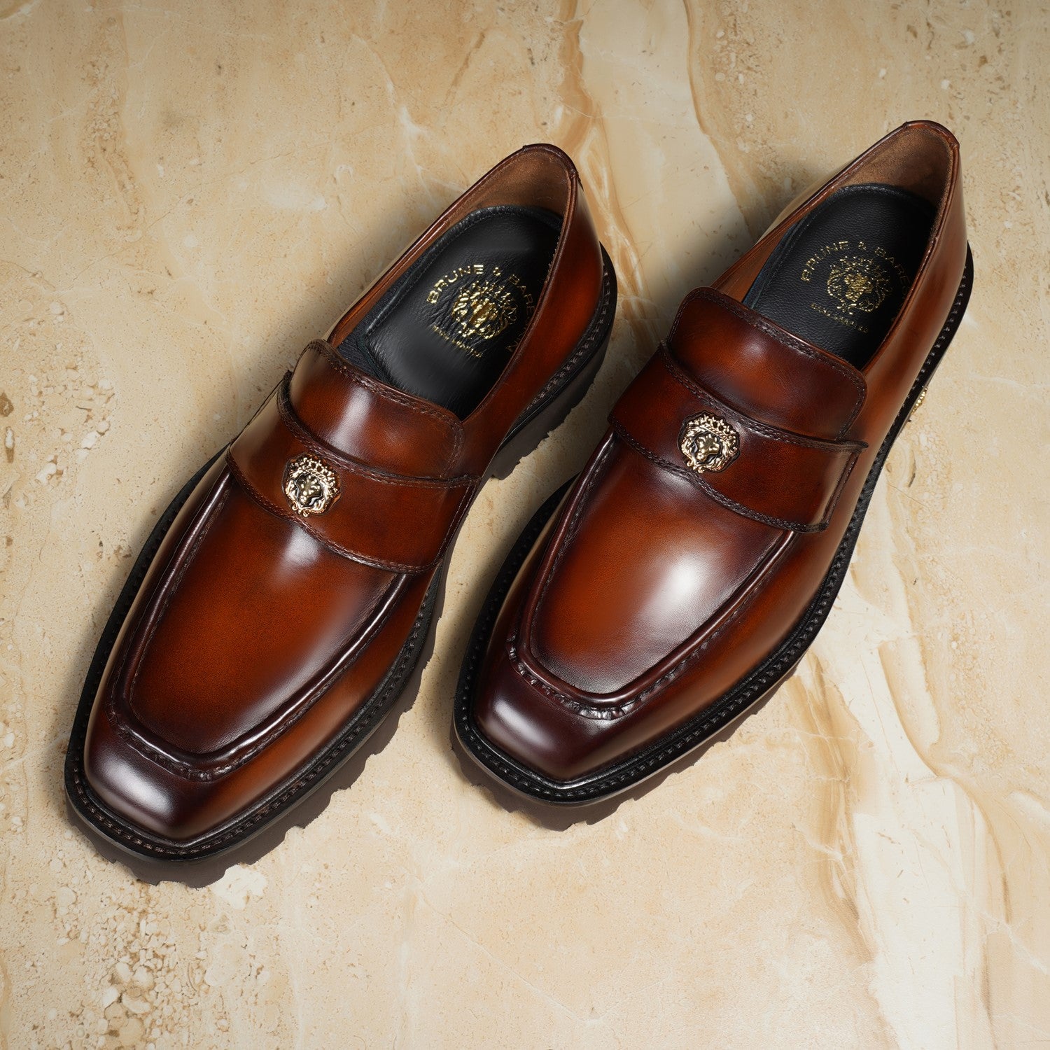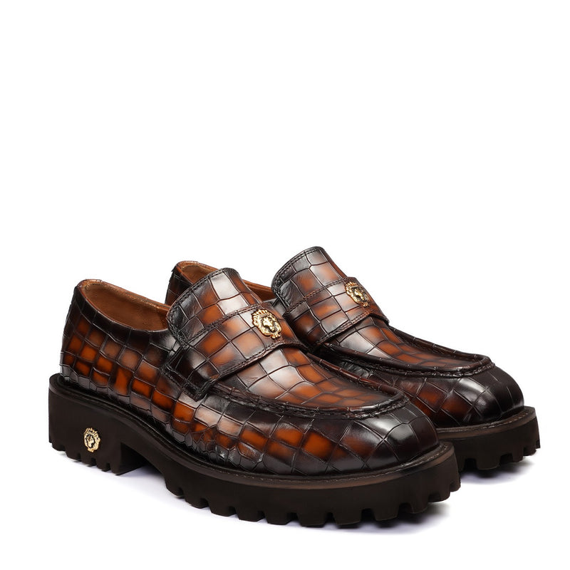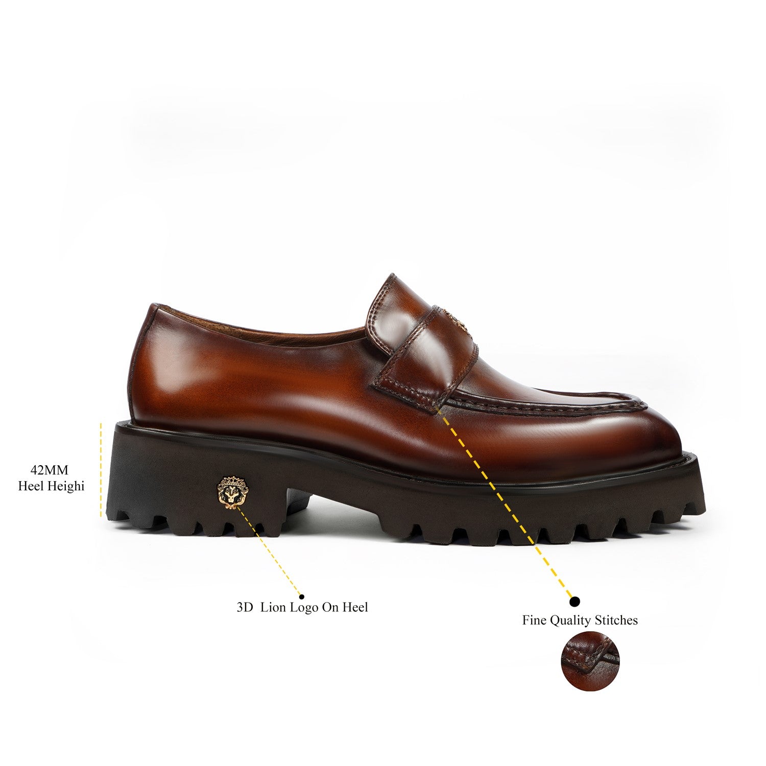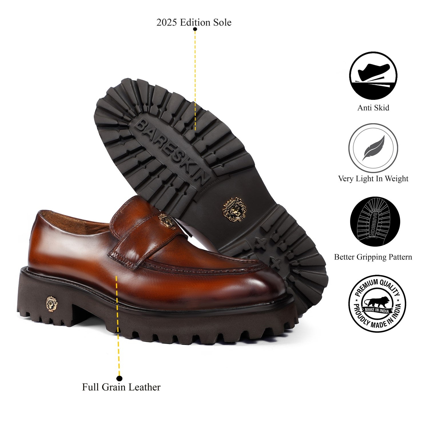 These Bareskin 2025 Edition loafers redefine casual luxury with burnished brown full-grain leather. The chunky platform sole delivers elevated stance and all-day comfort, featuring an anti-skid grip pattern for superior traction on urban streets or slick surfaces.