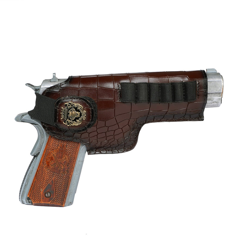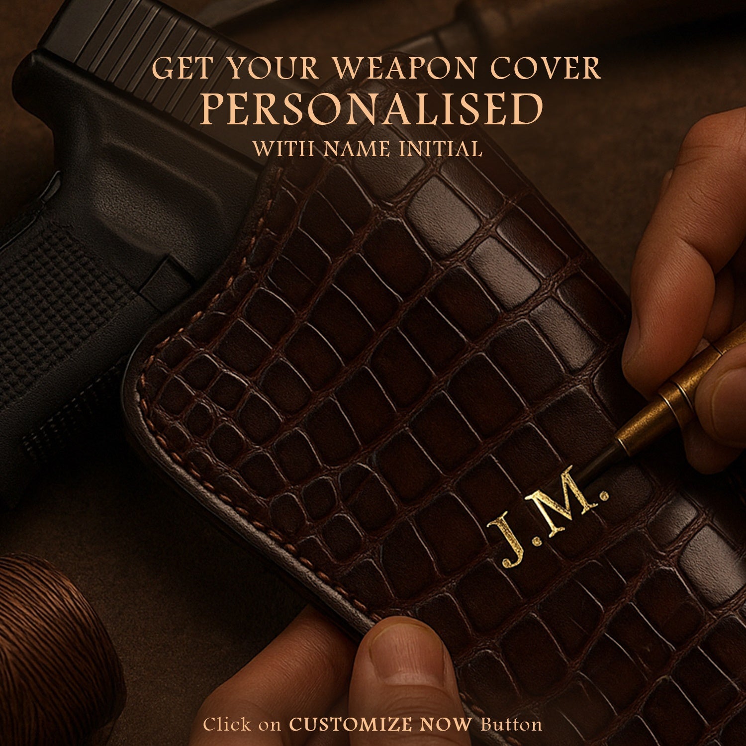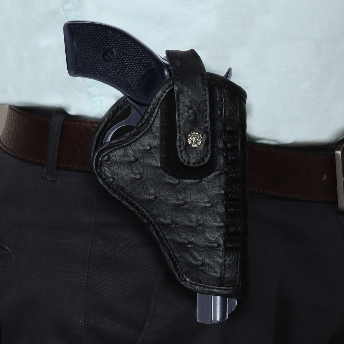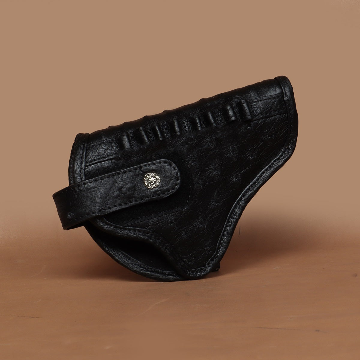 It's super stylish & elegant Gun cover by BRUNE & BARESKIN. Made of Exotic ostrich leather in black color. Brune & Bareskin's signature mini metal lion logo on Velcro strap, belt loop and the Bullet Holder Cover is added to enhance the elegance further. It gives classy look to a person when some one holds it. This particular sku is specific to .32 revolvers, Indian or imported. Fits perfect on WEBLEY and Indian ordinance revolver. Bullet's holders are crafted to provide the easy access to the bullets & hold them safely. These covers are hand crafted and hand stitched in real ostrich leather with 2 in 1 purpose, which is gives the detailing and quality to be with you forever, just as your weapon. The natural texture of Ostrich Leather adds an extra element of style. We offer name Initials and other personalization like color change, laser engraving of logos or slogans. For this please write to us by choosing the "customization tab".