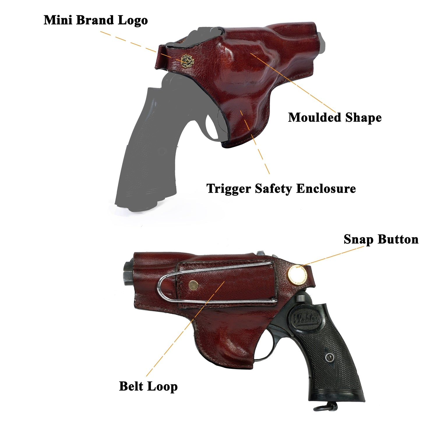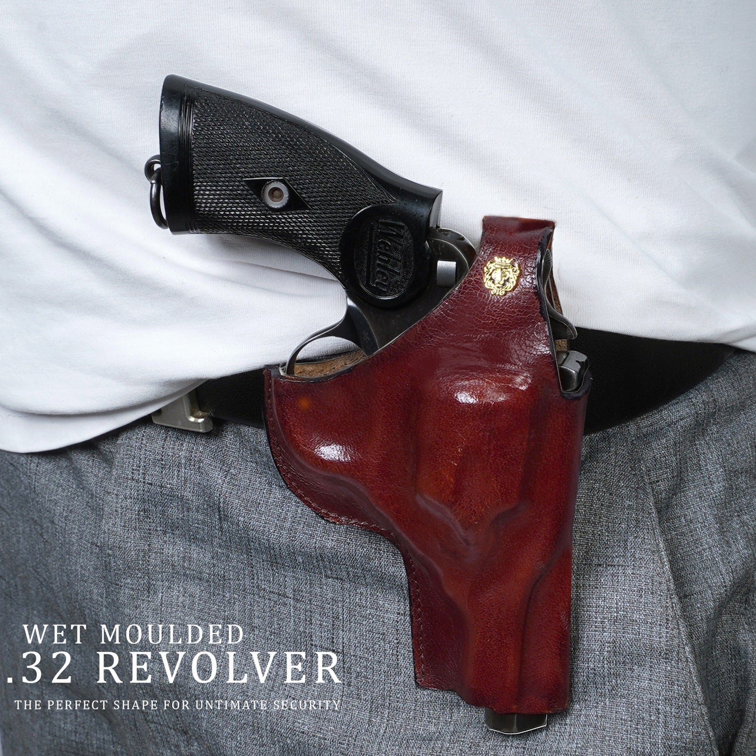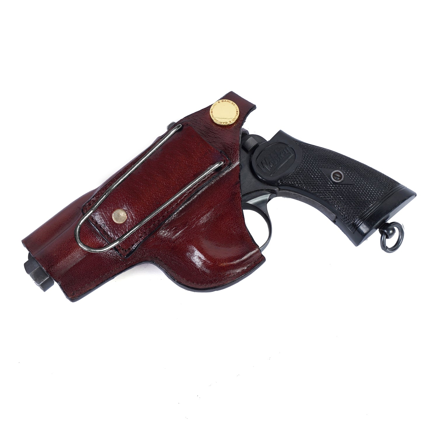 Introducing the Brune & Bareskin .32 Brown Wet Moulded Revolver Cover, a meticulously handcrafted piece of art that showcases the perfect blend of luxury and functionality. Skillfully made from genuine leather through a long and precise process. It also adds a secure closure for the weapon by locking it in. This brown-colored holster can be customized with your name initials for a truly exclusive personal touch. Keep your revolver safe and secure in style with this Brune & Bareskin premium weapon covers and holsters.