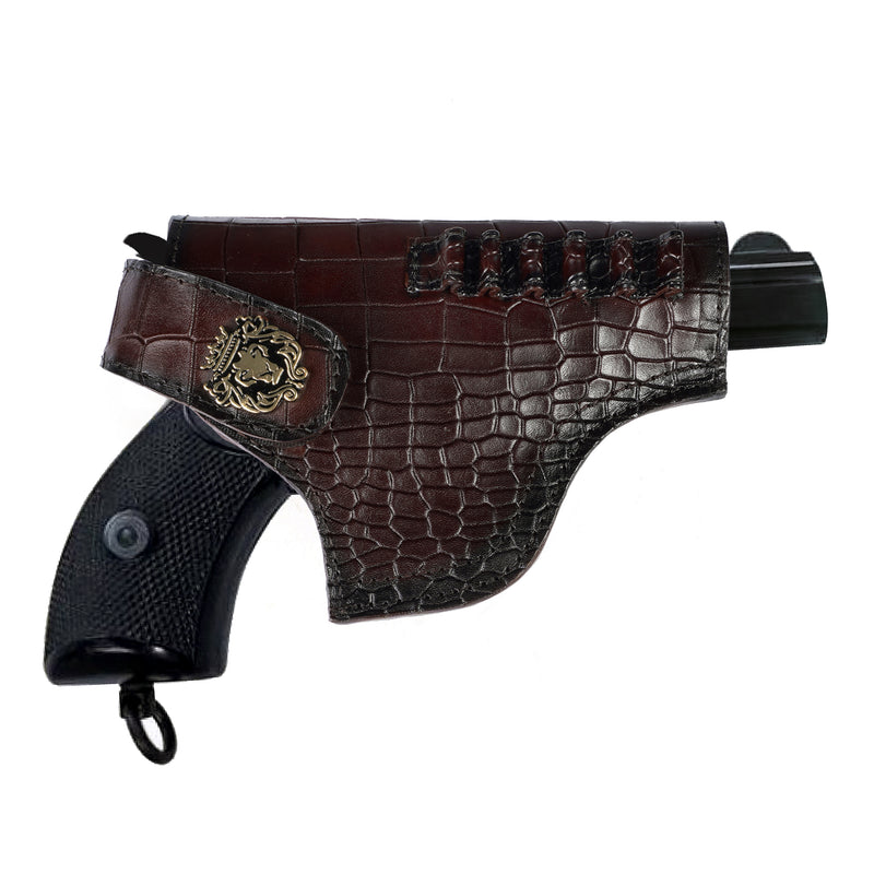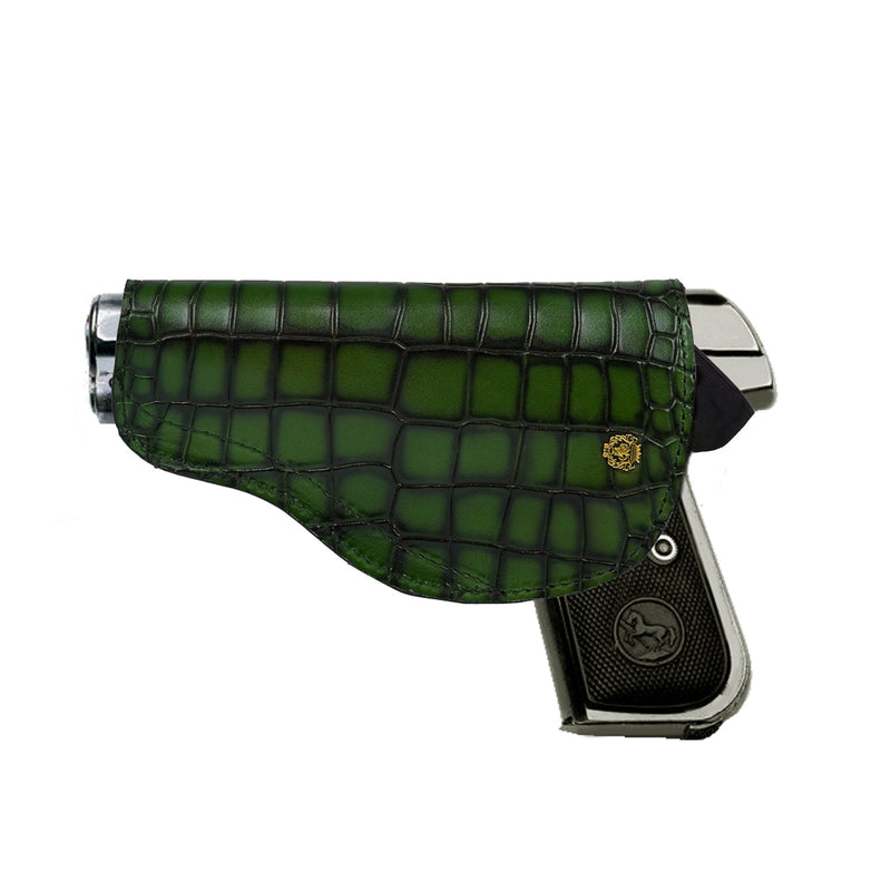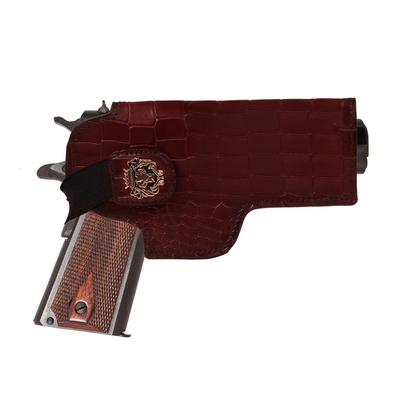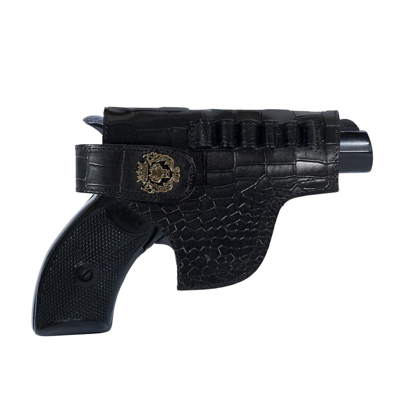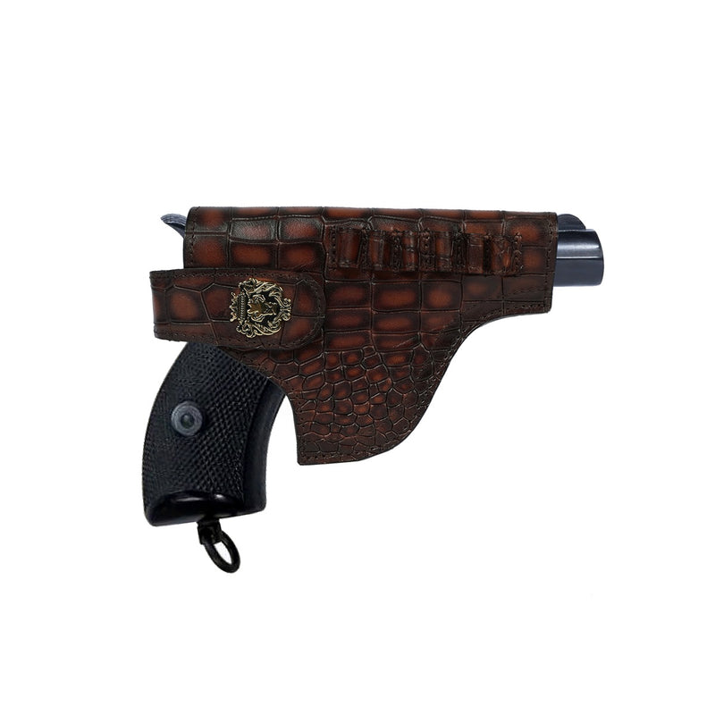 Upgrade your .32 Handgun with this luxurious exotic pistol cover. Hand-crafted with premium, high-quality grey leather and adorned with a signature lion mini logo, this cover is both stylish and functional. The unique stingray fish leather design is not only water and scratch-resistant but also adds a natural shine to your firearm. Its adjustable elastic closure and metal loop make for easy and secure carrying. Elevate your firearm with this elegant and one-of-a-kind choice.