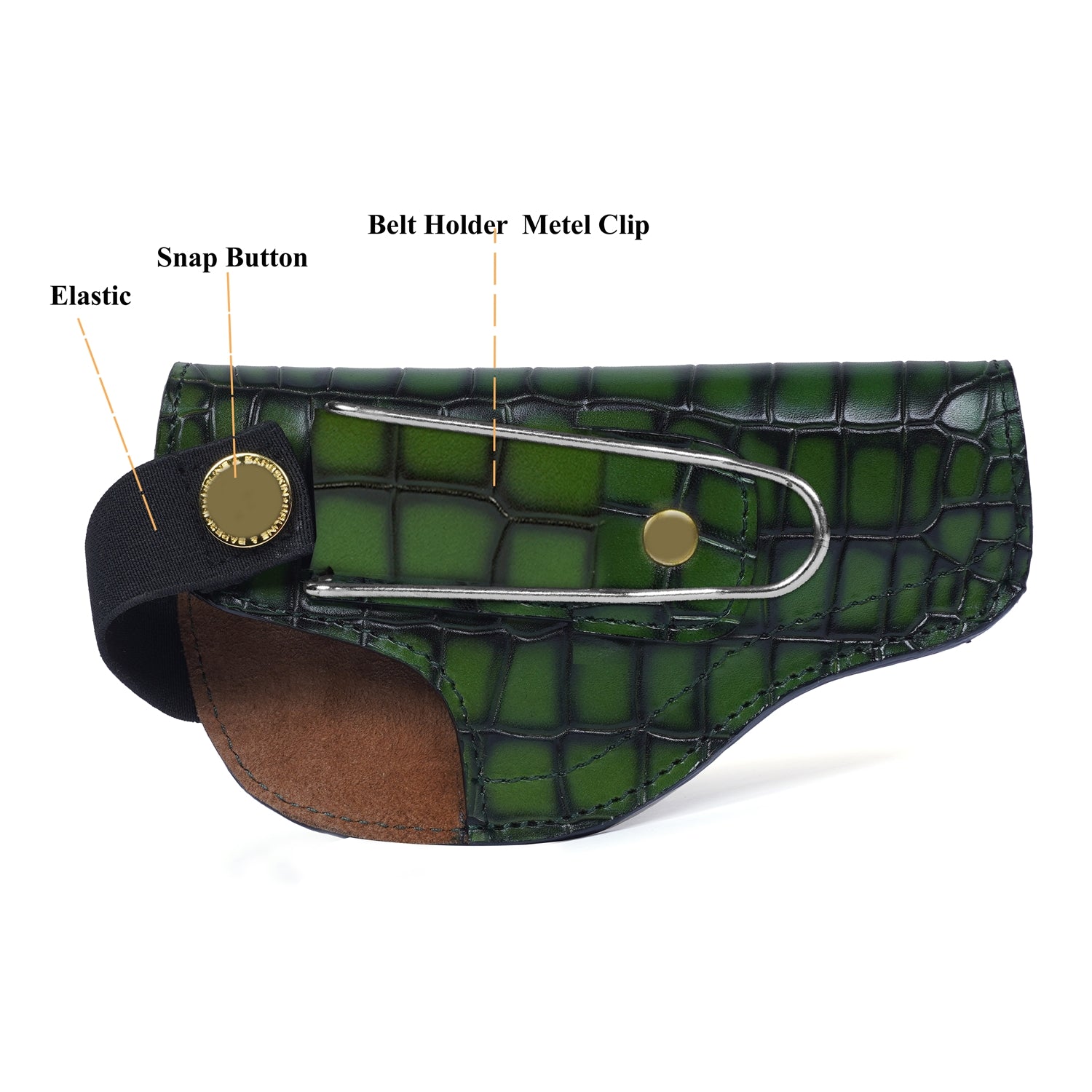 Elevate your style with the BRUNE & BARESKIN .32 Smokey Finish Handgun. Crafted with premium quality and a patina finish, this gun is beautifully encased in a deep cut green leather cover. Its elastic closure with snap button and metal belt holder make carrying easy and secure. A super stylish and elegant choice for those who demand sophistication. Handmade and adorned with a signature lion mini logo, this gun exudes a classy aesthetic.