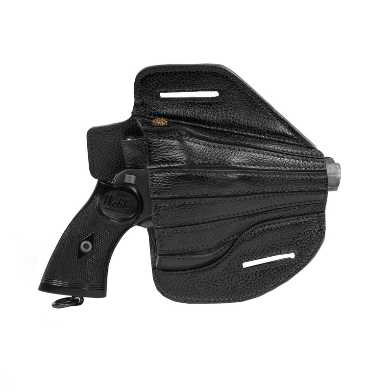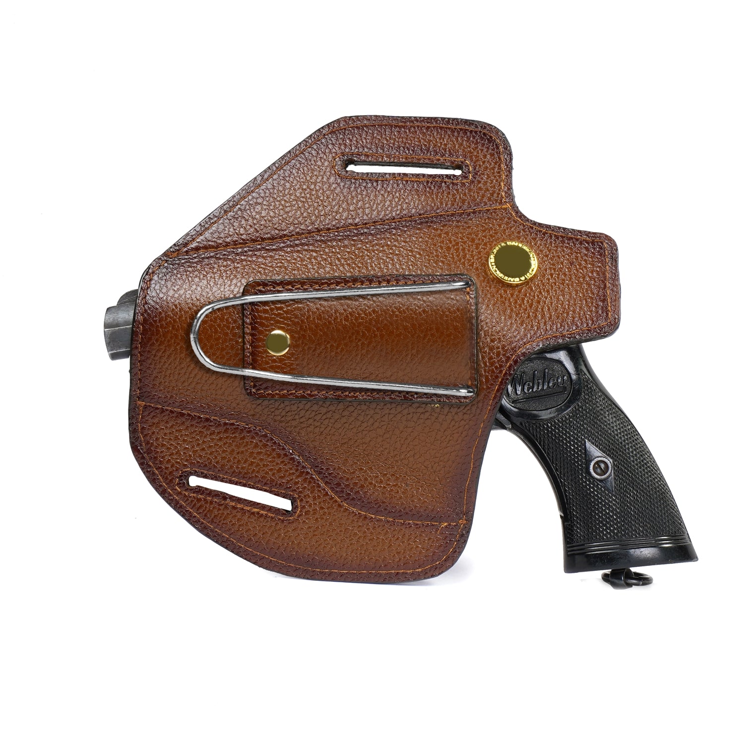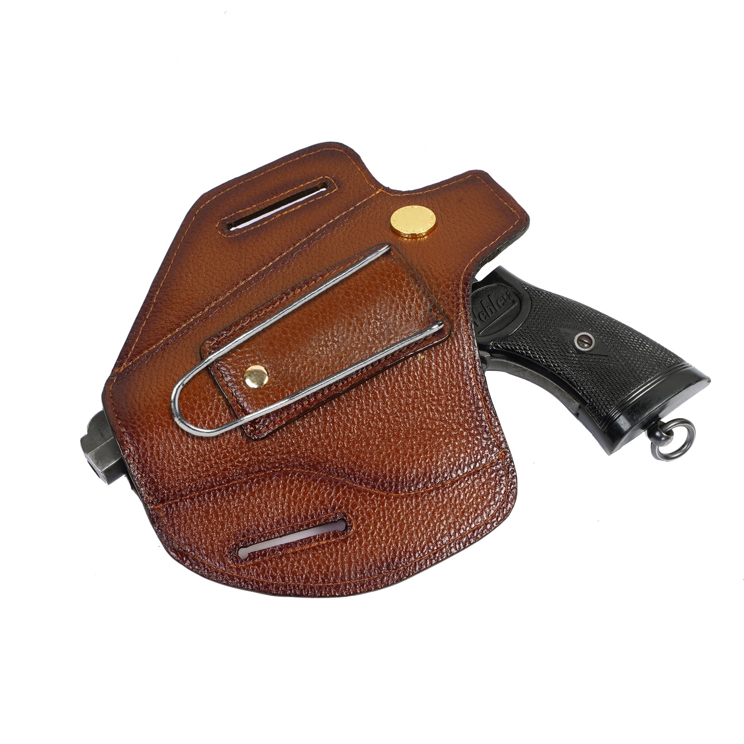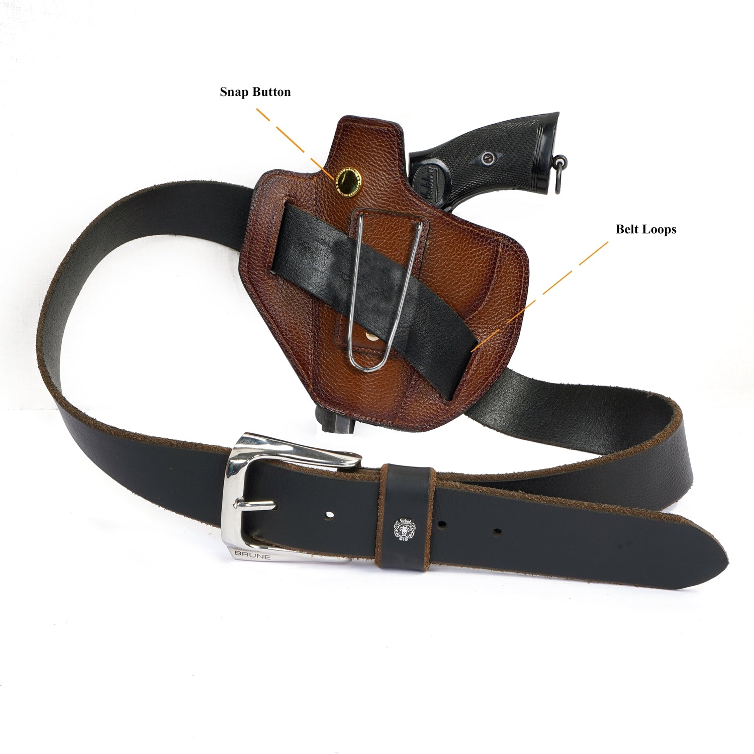 Protect your weapon in style with our Brune & Bareskin .32 revolver cover, made with premium quality textured leather and elastic closure for a snug fit. This armour cover is hand crafted with fine quality stitched detail. The tan color adds a touch of sophistication. Perfect for your belt loop, this cover is the ideal choice for any firearm owner.