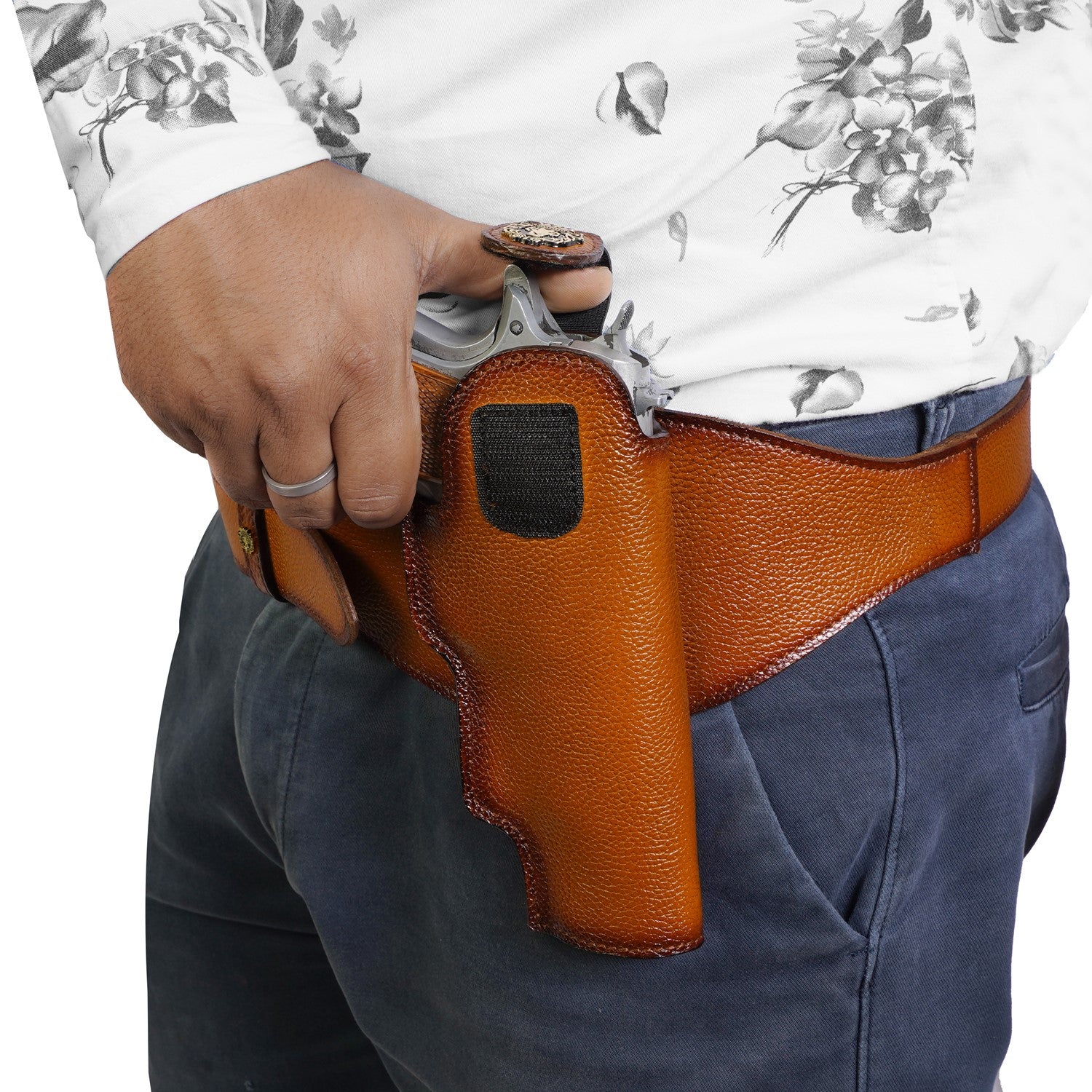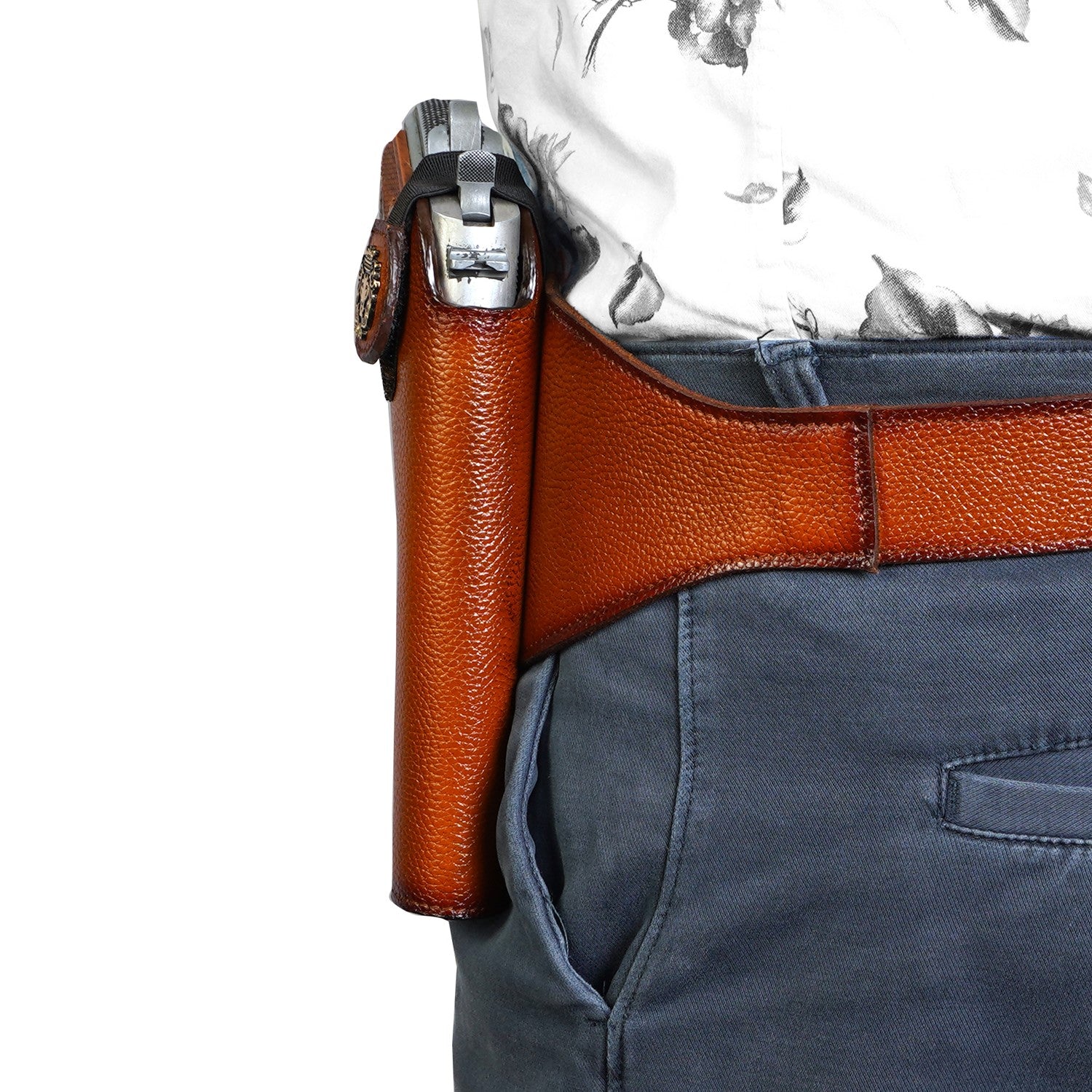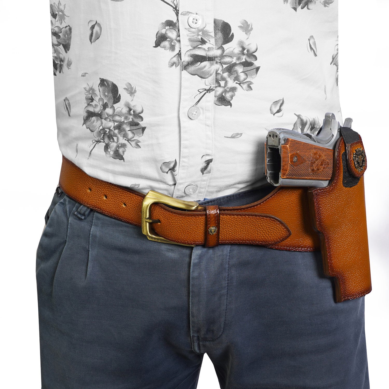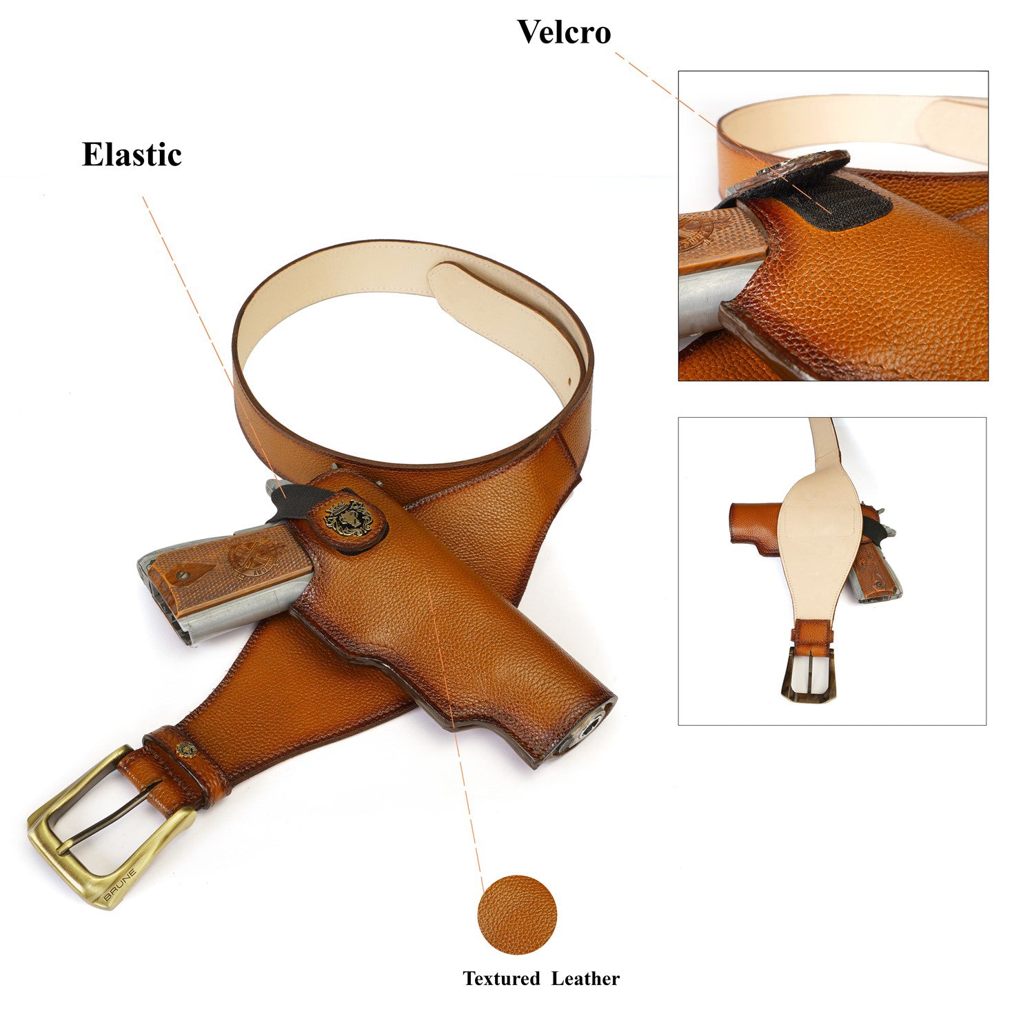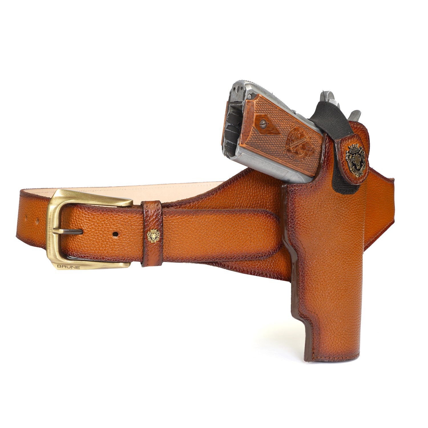 Experience the luxury of the Brune & Bareskin .45 Bore Revolver Cover with Fixed Belt, crafted with concealed gun cover and a rich belt buckle. With a tan color and handmade styling, the belt's Velcro closure gun cover is finished with a golden finish lion logo, adjustable belt, and textured leather for a truly stylish look.