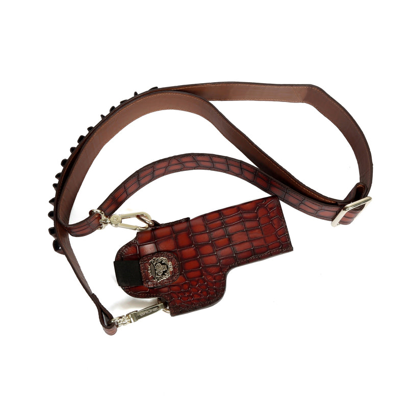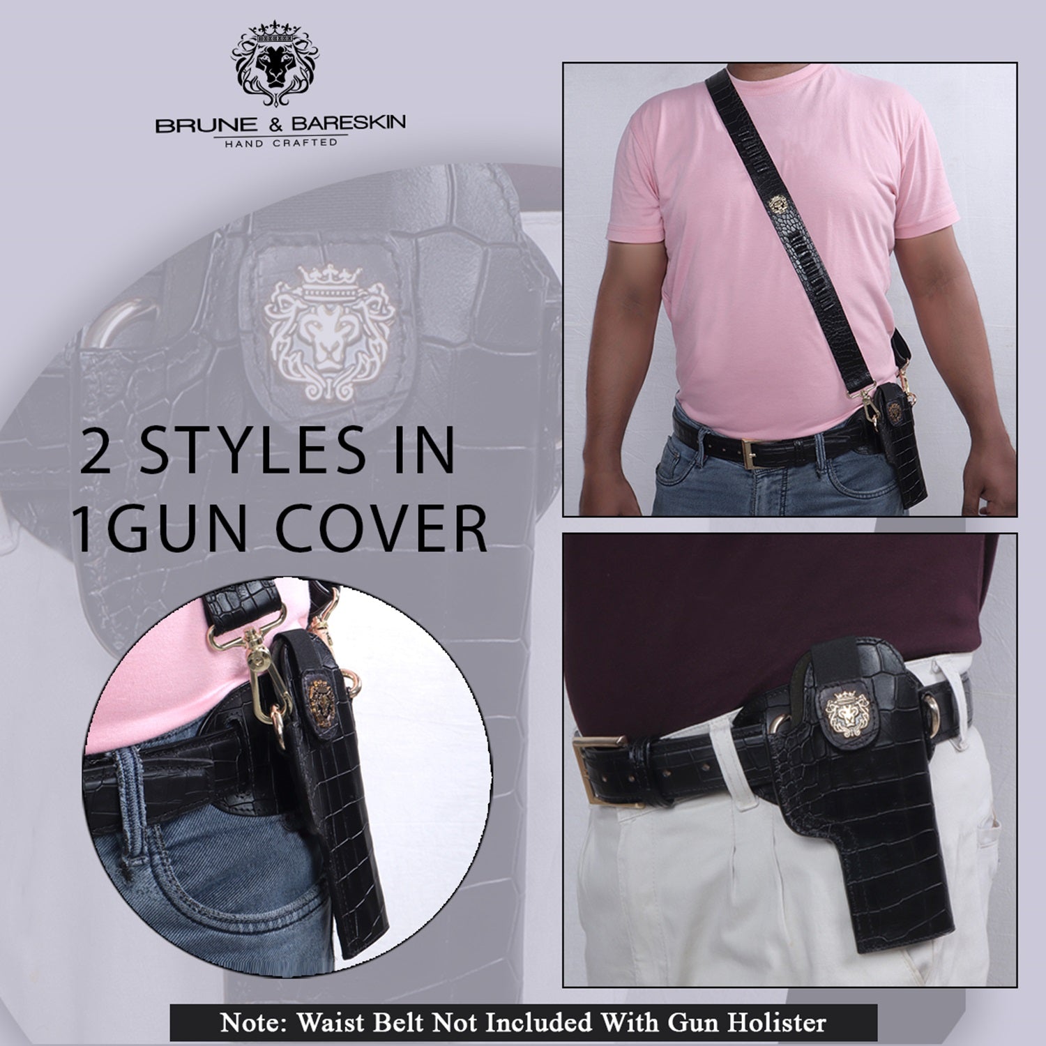 Enjoy the convenience and luxury of carrying your ammo in style! Carry your pistol with style, confidence, and convenience with the Two In One Style Gun Cover from Brune & Bareskin. This Two In One Style Gun Cover by Brune & Bareskin features an exquisite black Croco Textured leather design, offering men a sophisticated way to carry their pistol both as a crossbody bag or with a belt loop. Designed with practicality and style in mind, this ammo cover boasts a strong and wide adjustable cross-body croco textured leather strap. The strap can be easily tailored to your desired length, ensuring a comfortable fit during transport. Whether you're heading to the range or engaging in tactical operations, this cover allows you to carry your ammunition with ease and confidence. The adjustable bullet holder leather strap, and metal lion brand logo bring extra style and flair to this luxurious accessory. Make a statement with this perfect combination of sleekness, practicality, and security.