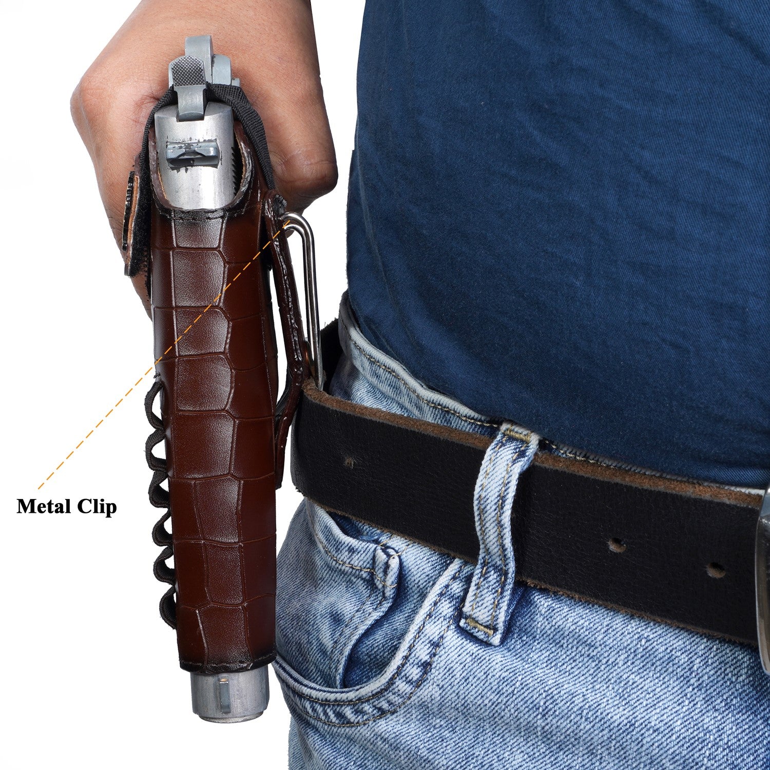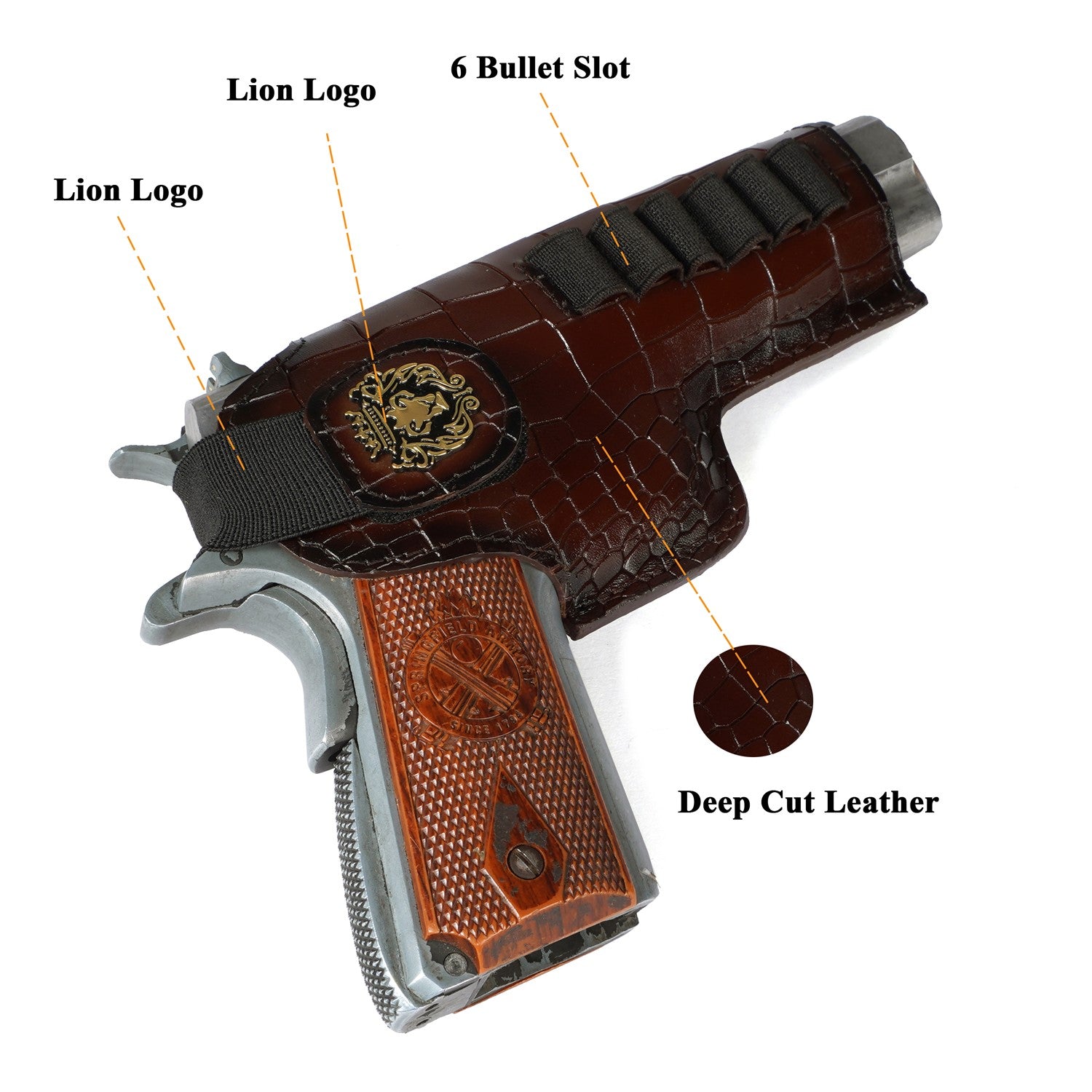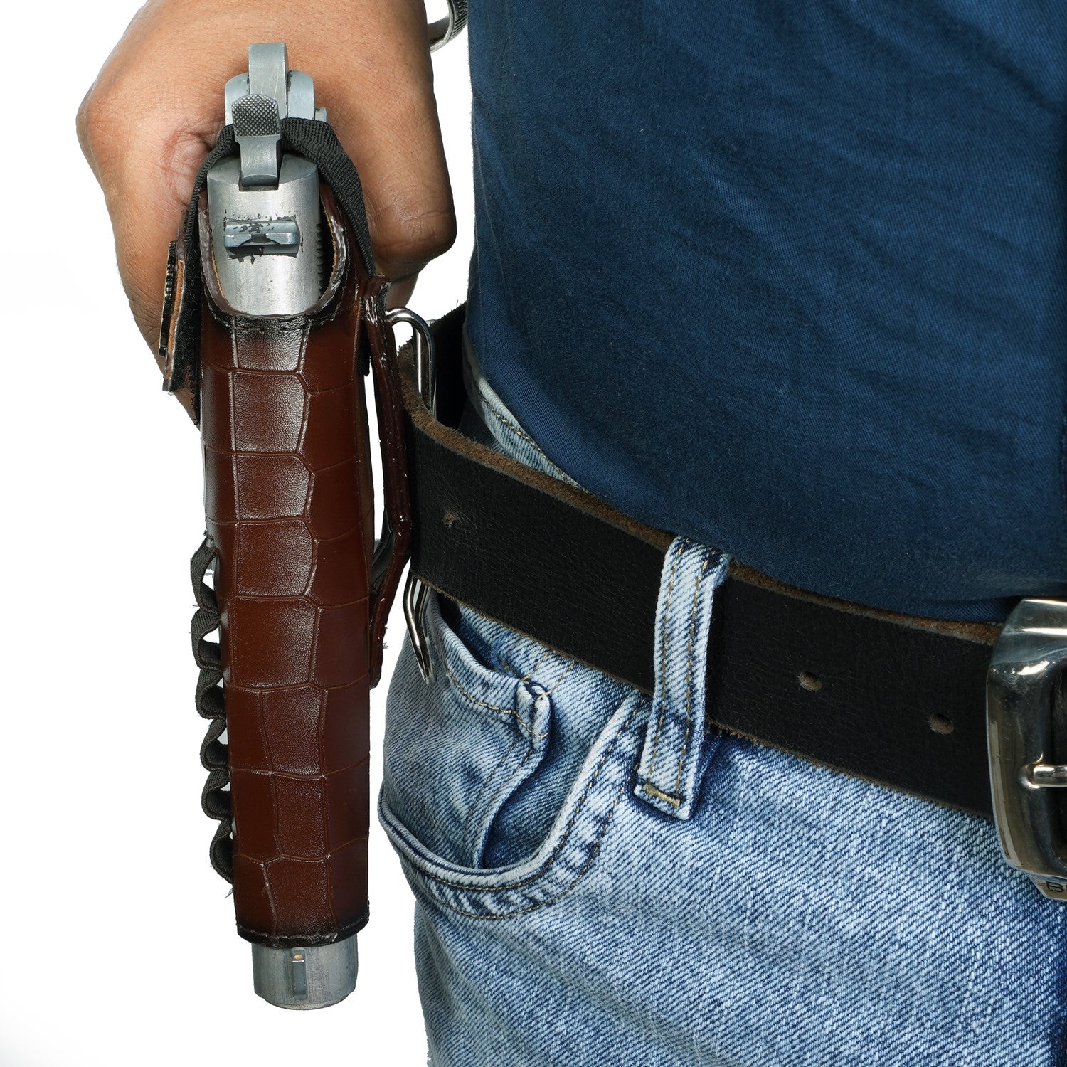 It's super stylish & elegant Gun cover by BRUNE & BARESKIN. Made of Croco Textured leather in dark brown color. Brune & Bareskin's signature metal lion logo on wide Velcro strap and the Bullet Holder Cover is added to enhance the elegance further. It gives classy look to a person when some one holds it. This can be customized to any size weapon .32, 9mm and .45 pistol. We offer name Initials and other personalization like color change, laser engraving of logos or slogans. For this please write to us by choosing the "customization tab".