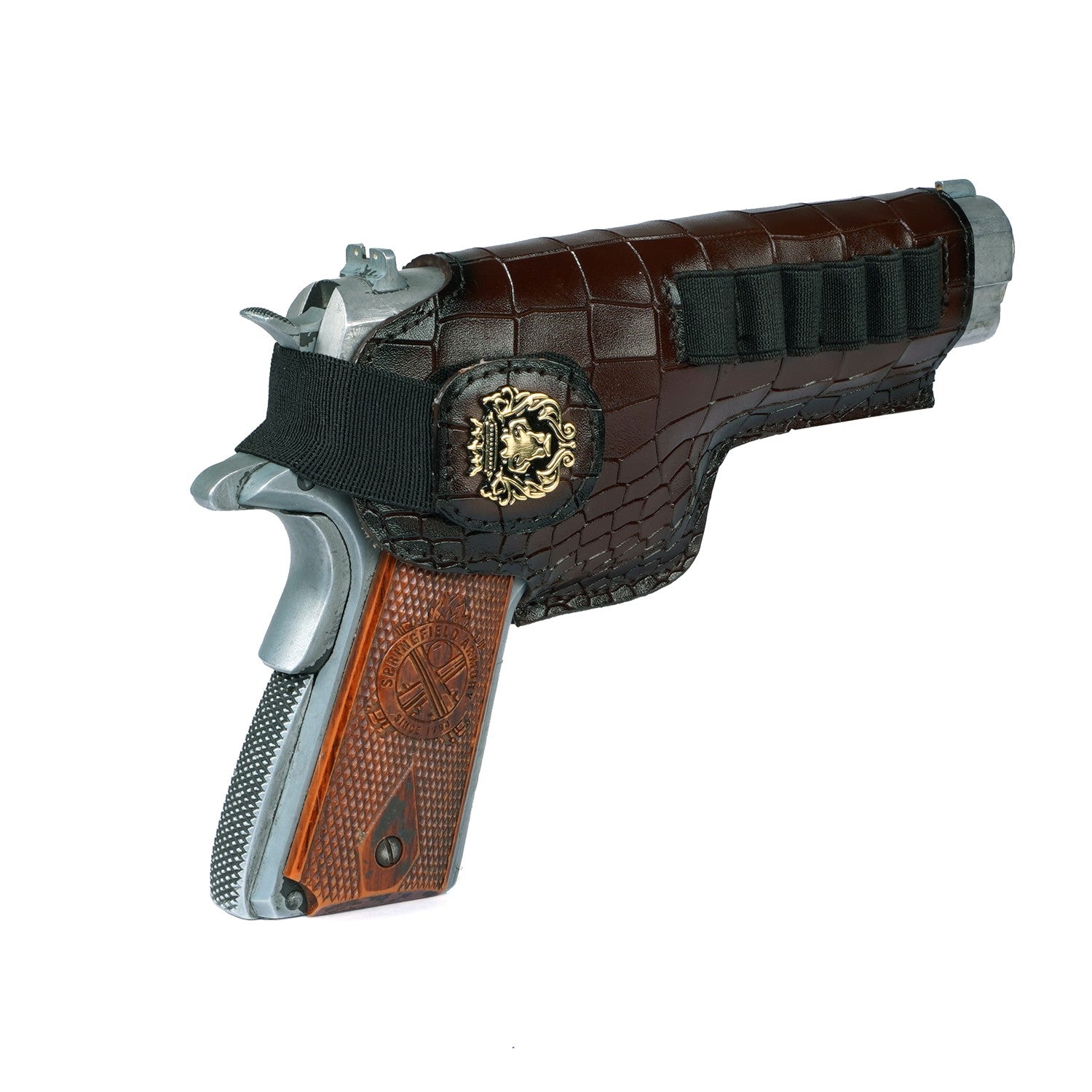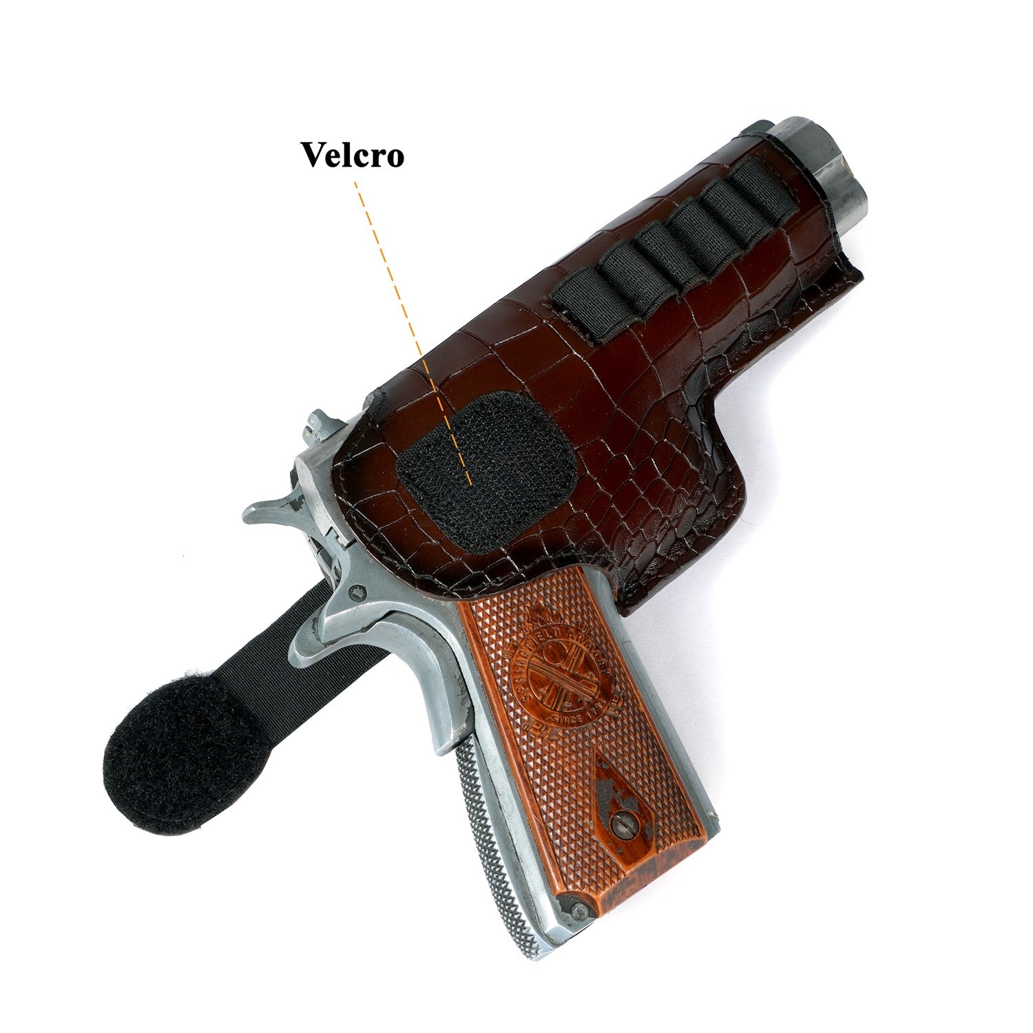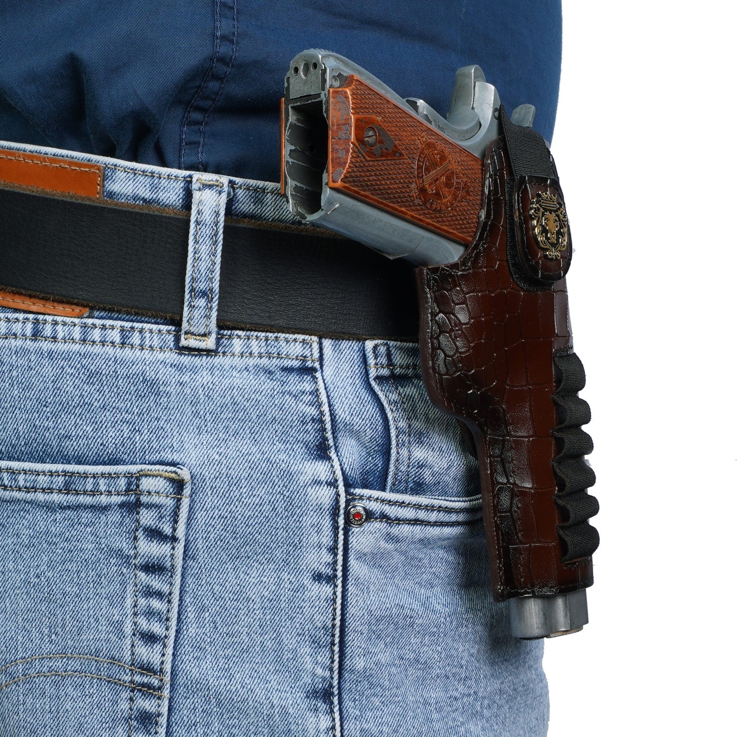 It's super stylish & elegant Gun cover by BRUNE & BARESKIN. Made of Croco Textured leather in dark brown color. Brune & Bareskin's signature metal lion logo on wide Velcro strap and the Bullet Holder Cover is added to enhance the elegance further. It gives classy look to a person when some one holds it. This can be customized to any size weapon .32, 9mm and .45 pistol. We offer name Initials and other personalization like color change, laser engraving of logos or slogans. For this please write to us by choosing the "customization tab".