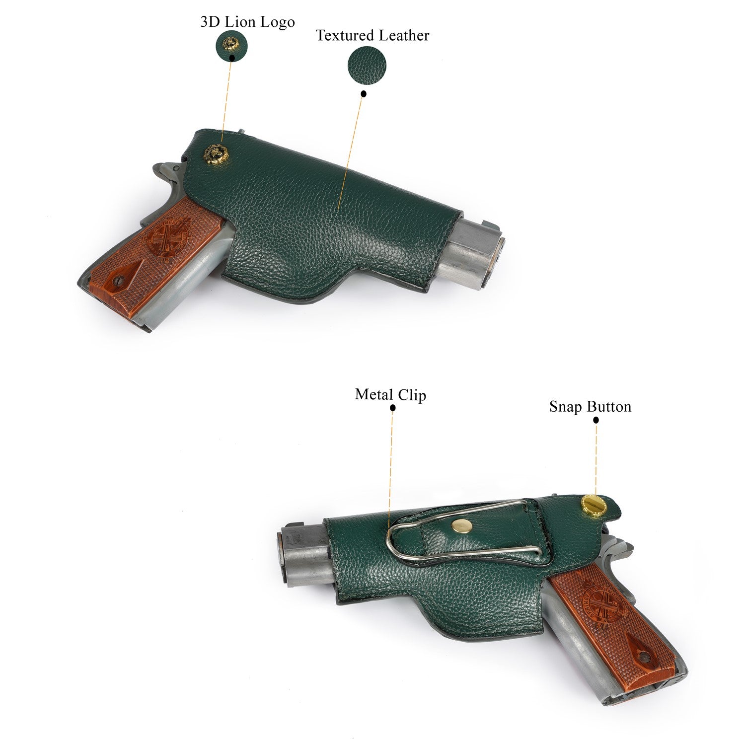 It's super stylish & elegant Gun cover by BRUNE & BARESKIN. Made of textured leather in green color. Brune & Bareskin's signature metal lion logo & snap button closure is added to enhance the elegance further. It gives classy look to a person when some one holds it. This can be customized to any size weapon .32, 9mm and .45 pistol. We offer name Initials and other personalization like color change, laser engraving of logos or slogans. For this please write to us by choosing the "customization tab"