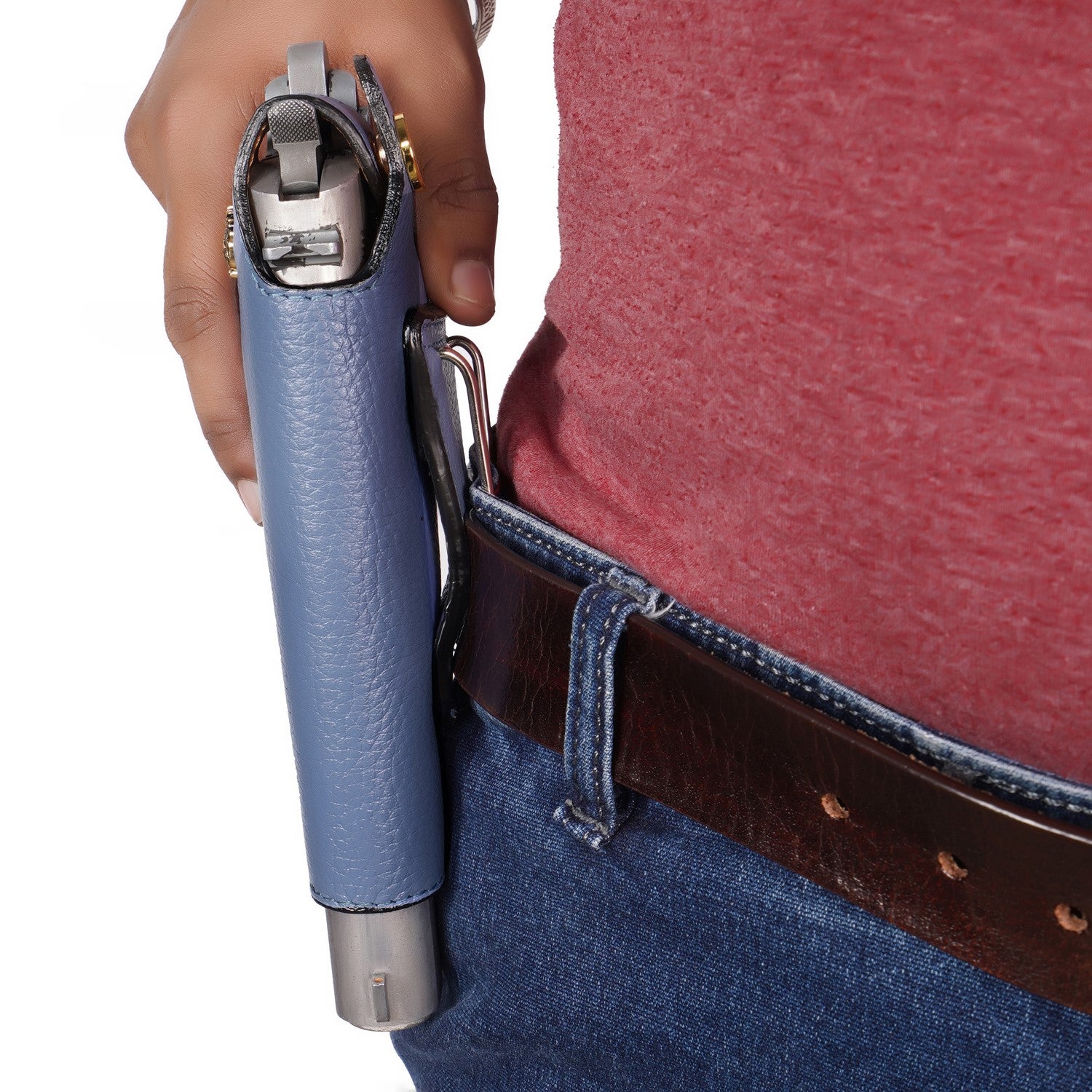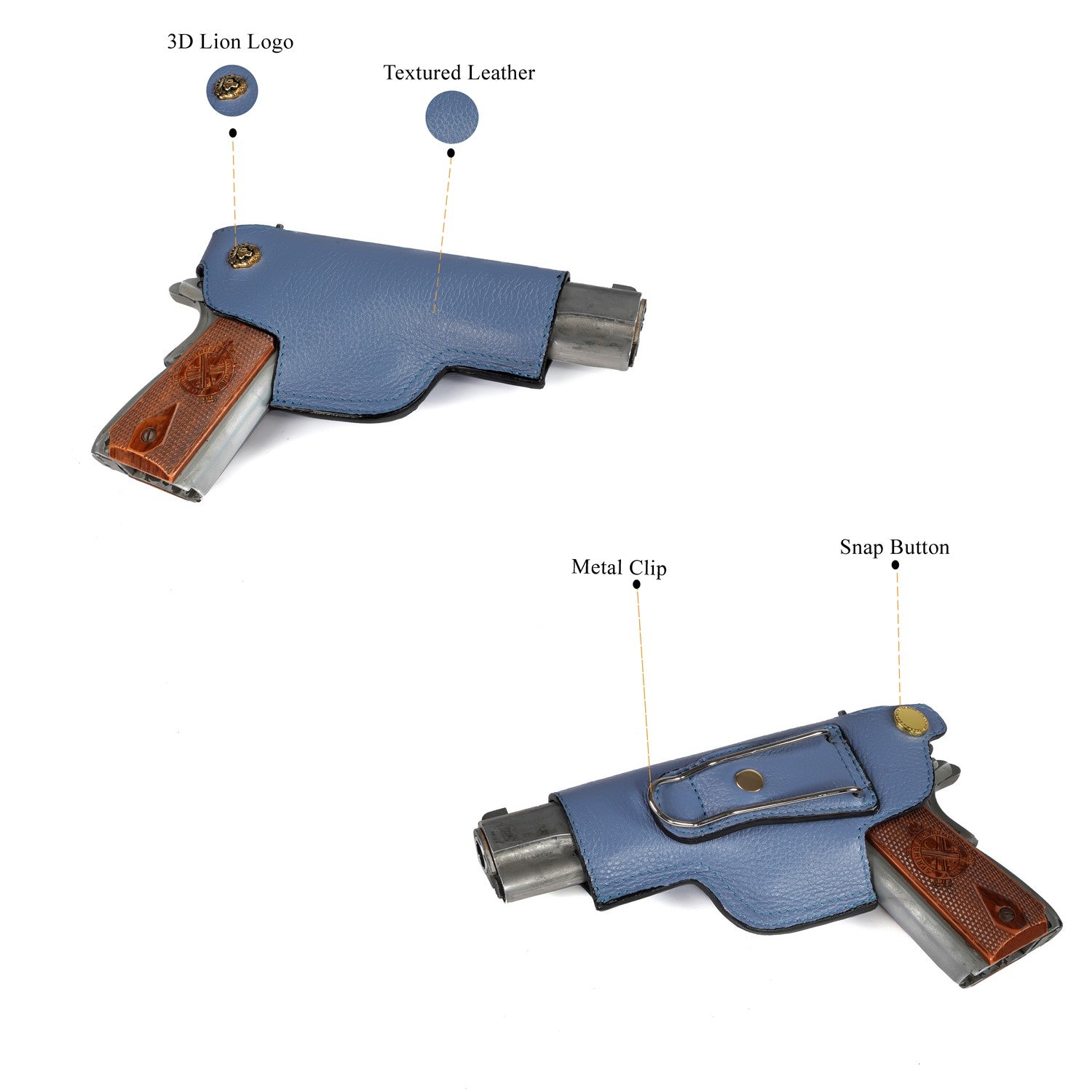 It's super stylish & elegant Gun cover by BRUNE & BARESKIN. Made of textured leather in sky blue color. Brune & Bareskin's signature metal lion logo & snap button closure is added to enhance the elegance further. It gives classy look to a person when some one holds it. This can be customized to any size weapon .32, 9mm and .45 pistol. We offer name Initials and other personalization like color change, laser engraving of logos or slogans. For this please write to us by choosing the "customization tab"