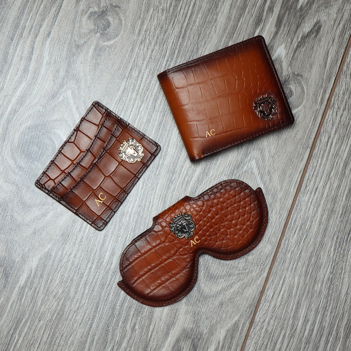 AC Initials Customised Tan Leather Combo of Cardholder,Wallet & Eyewear Glasses Cover by Brune & Bareskin