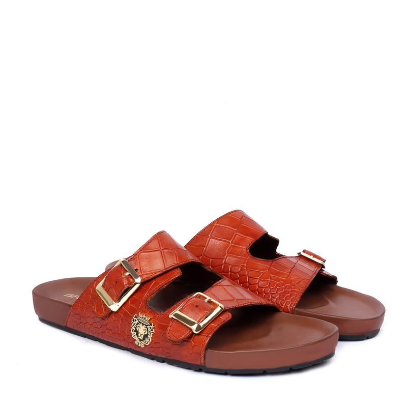 When it comes to Slippers, comfortably is the highest priority. These Cut Croco leather Slippers are the luxurious piece of beauty from Brune & Bareskin. These Double Monk Leather slippers are a must-have of the season. Deep cut Croco Adjustable buckle strap spells freedom and the casual lifestyle. The gel injected memory foam base is designed to provide you comfort while walking. We use special layering techniques to keep the base cozy and retain its shape. Cut Croco Adjustable buckled strap endows the extra room for every foot. The wider straps Design with BRUNE & BARESKIN Lion Logo enhance the elegance further. Anti-Skid outer leather sole ensures the perfect walking grip. Carry these with Jeans, Shorts, Capri's, and other casual wear to be a style leader.