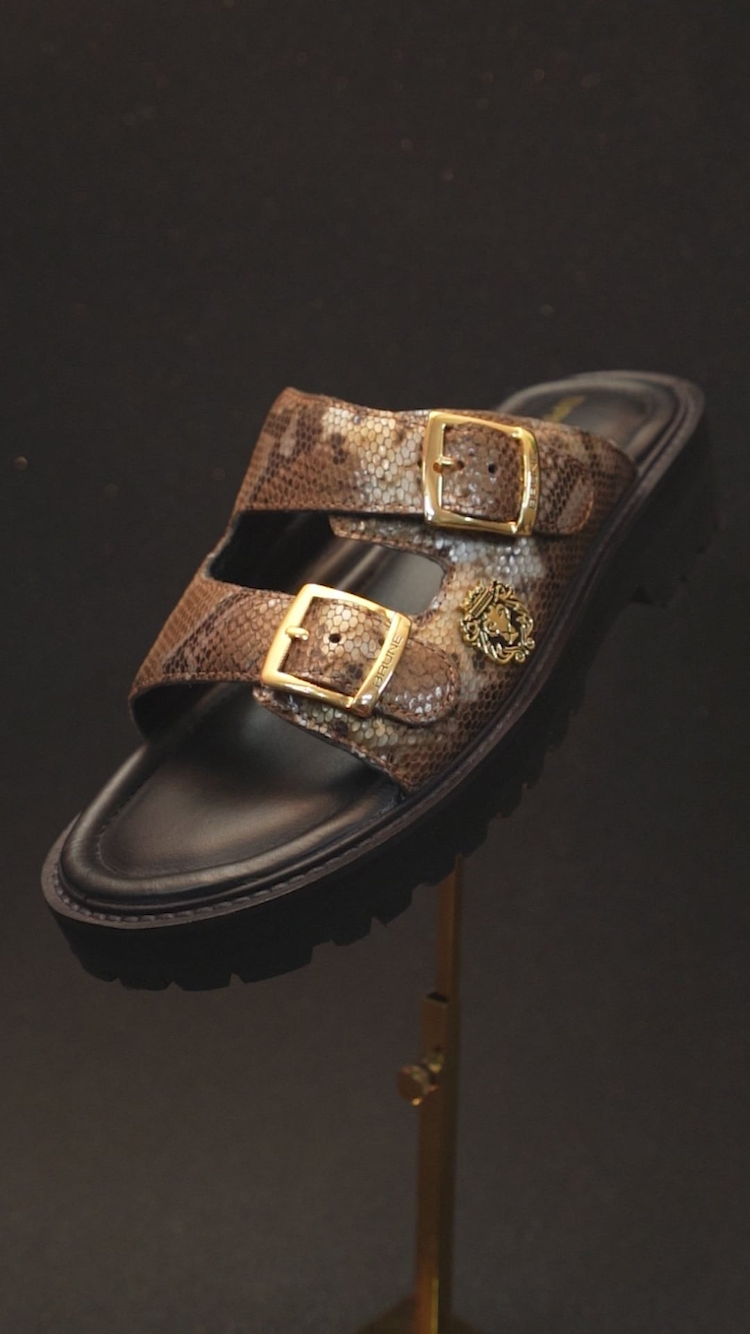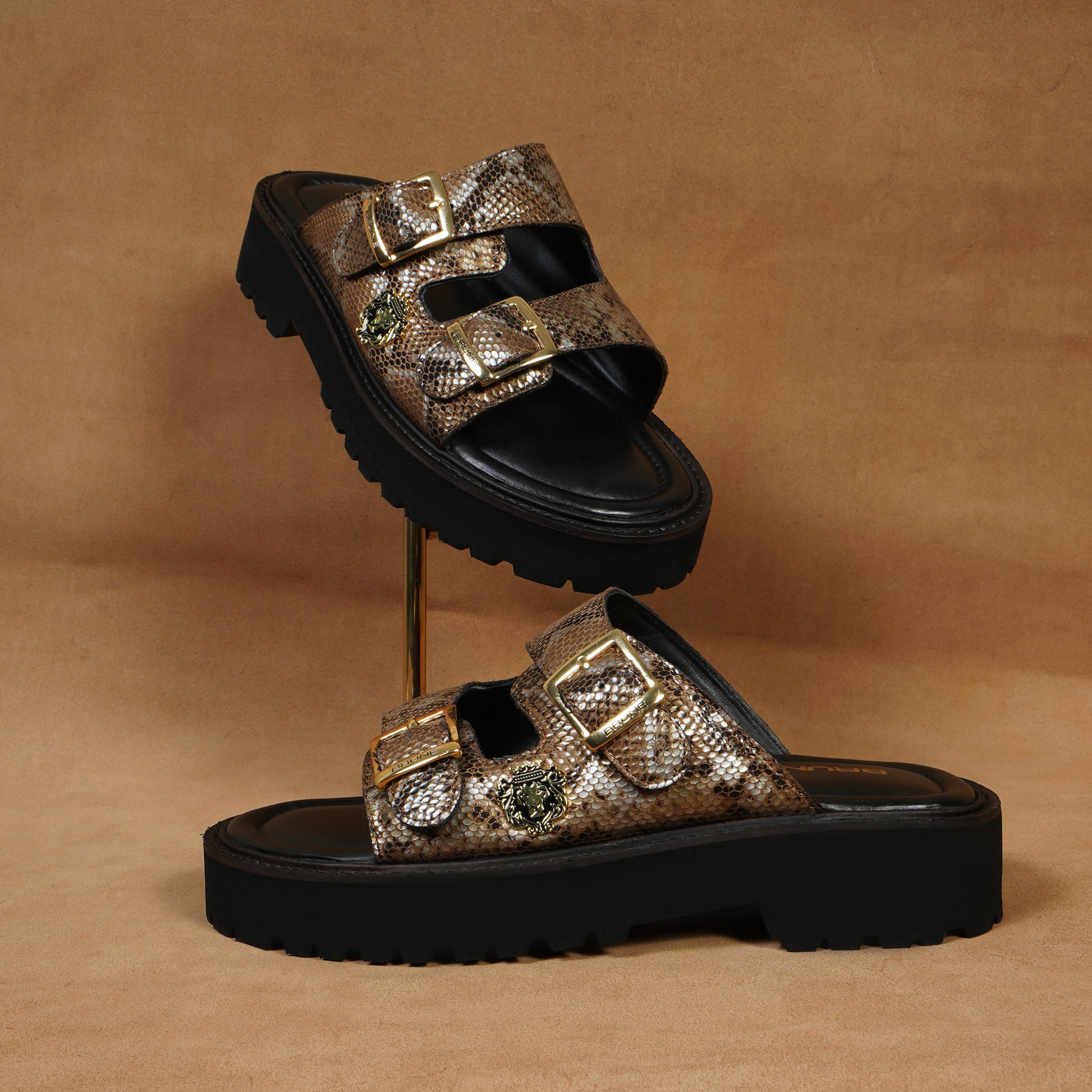Adjustable Buckle Leather Slipper in Snake Skin Textured