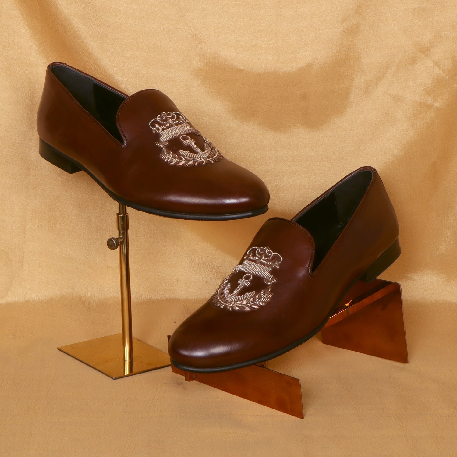 Dark Brown Leather Slip-On with Anchor Crown Crest Hand Made Zardosi