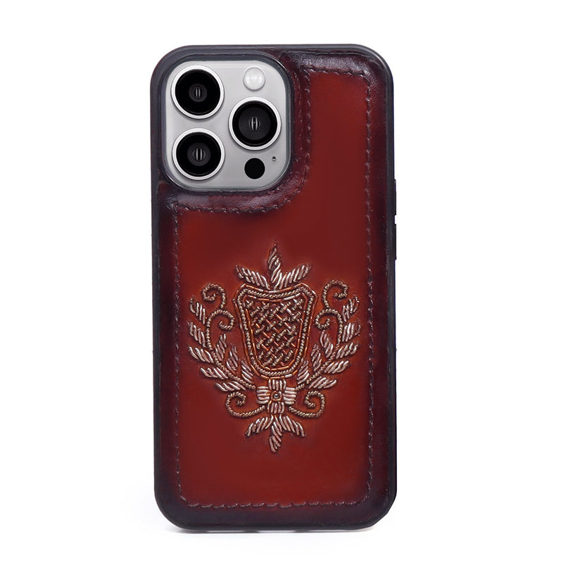 Apple iPhone Series Dark Brown Leather Crest Zardosi Mobile Cover