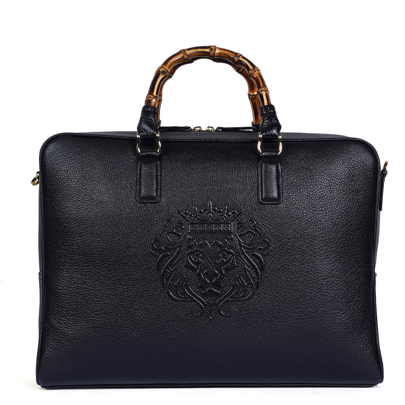 Experience the ultimate combination of style and function with the Bamboo Handle Black Laptop/Office Briefcase in Textured Leather! Handcrafted by Brune & Bareskin, this briefcase offers a unique and professional look with its premium quality textured leather and most special top bamboo handle. Stay organized with dedicated compartments for your laptop, pens, cards, and more. Perfect for business meetings and travel, this briefcase also features a detachable shoulder strap for added convenience. Elevate your professional style with this handcrafted masterpiece.