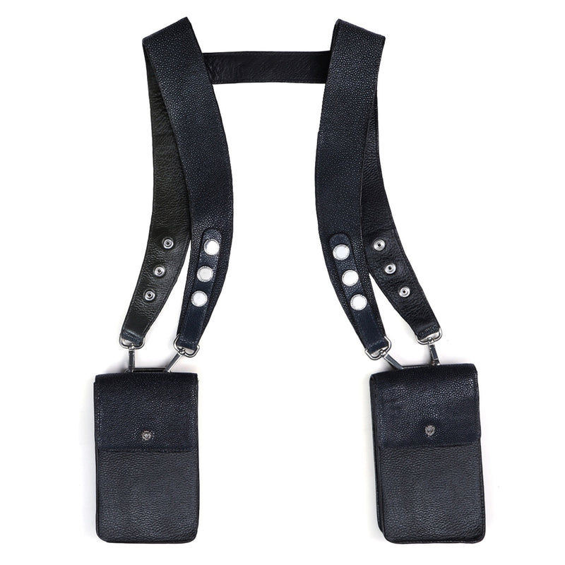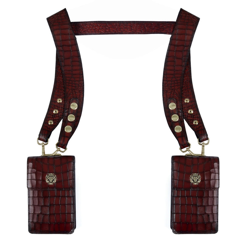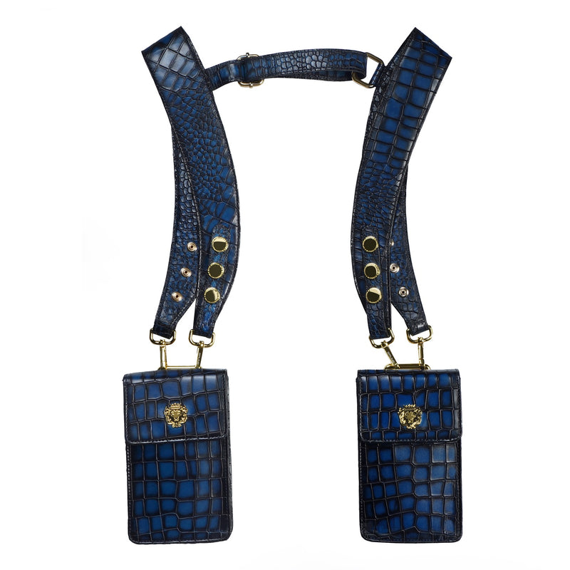 Expertly crafted by Brune & Bareskin, this dark brown croco embossed textured leather shoulder harness bag is the perfect combination of style and function. Designed for men, this bag features two convenient pouches and an adjustable strap that fits comfortably over the shoulders or around the waist. The metal finish lion logo and golden snap-button add a touch of sophistication to the spacious interior. Stay hands-free and organized with this high-quality leather bag.
