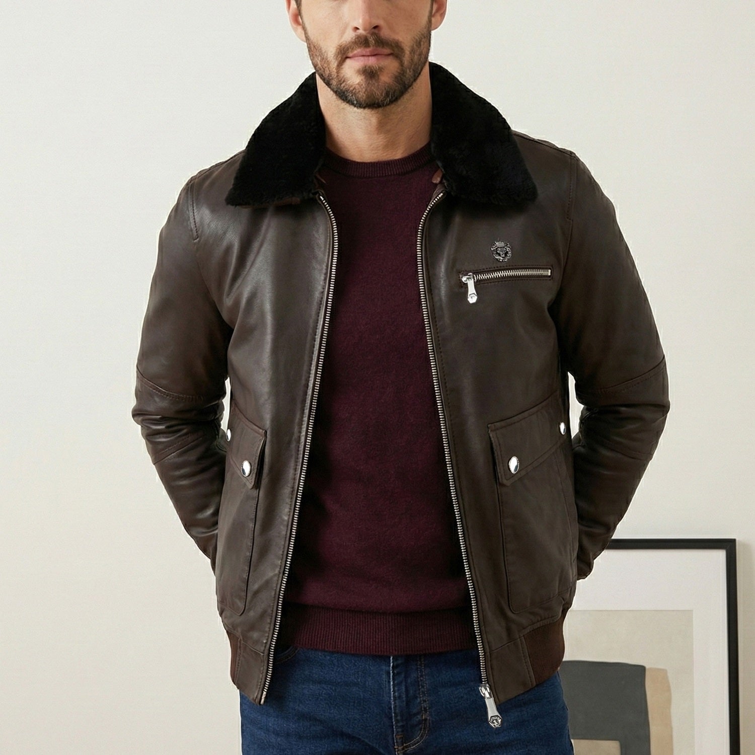 Dress to impress with this classic Leather Jacket from Brune & Bareskin. This jacket ensures that you look distinct and stylish in a crowded fashion-oriented world. If you're in need of an awesome, unique new piece to add to your wardrobe then you have come to the right place "Brune & Bareskin". This chic leather jacket has a shear ling fur collar with front zip closure and ribs on the sleeves end and the waist end of the jacket. Sheepskin is the most luxurious leather for its softness. It's naturally very lightweight. This is a must have Jacket to enhance the luxurious elegance in your wardrobe. The slim fit jacket ensures to fit properly according to your body structure. It is amazing to carry this jacket with a T-shirt, washed jeans, and casual shoes for a relaxed look.