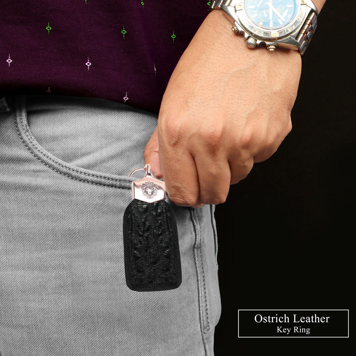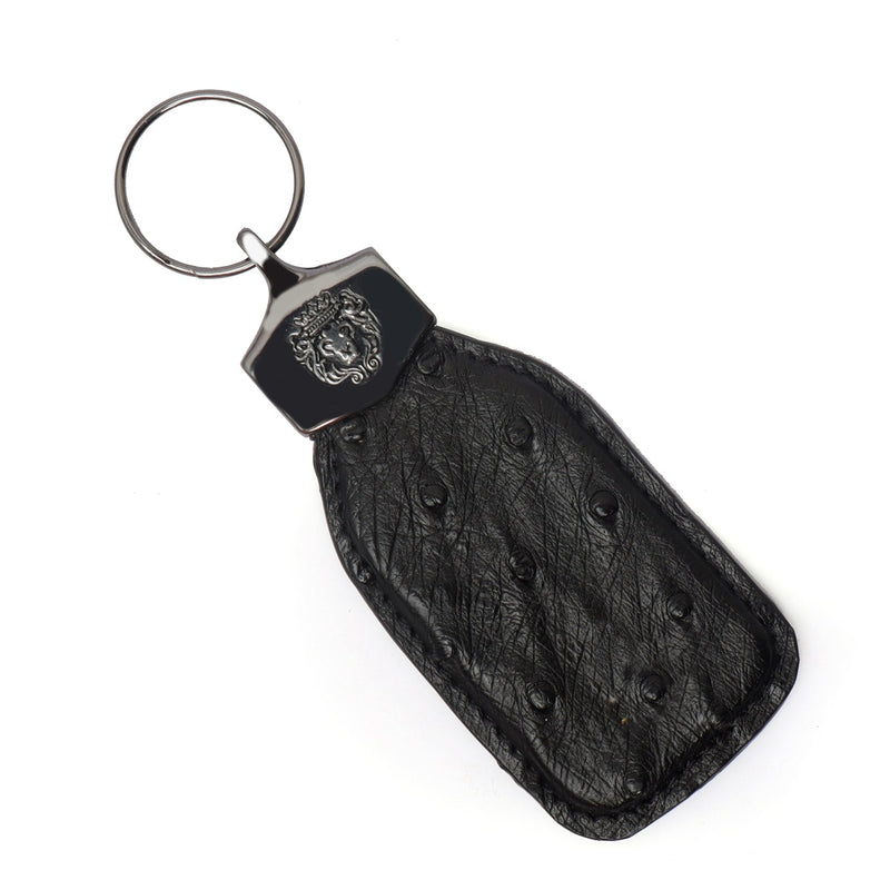 Exotic Ostrich Key-chain in Black Leather With Golden Lion Buckle
