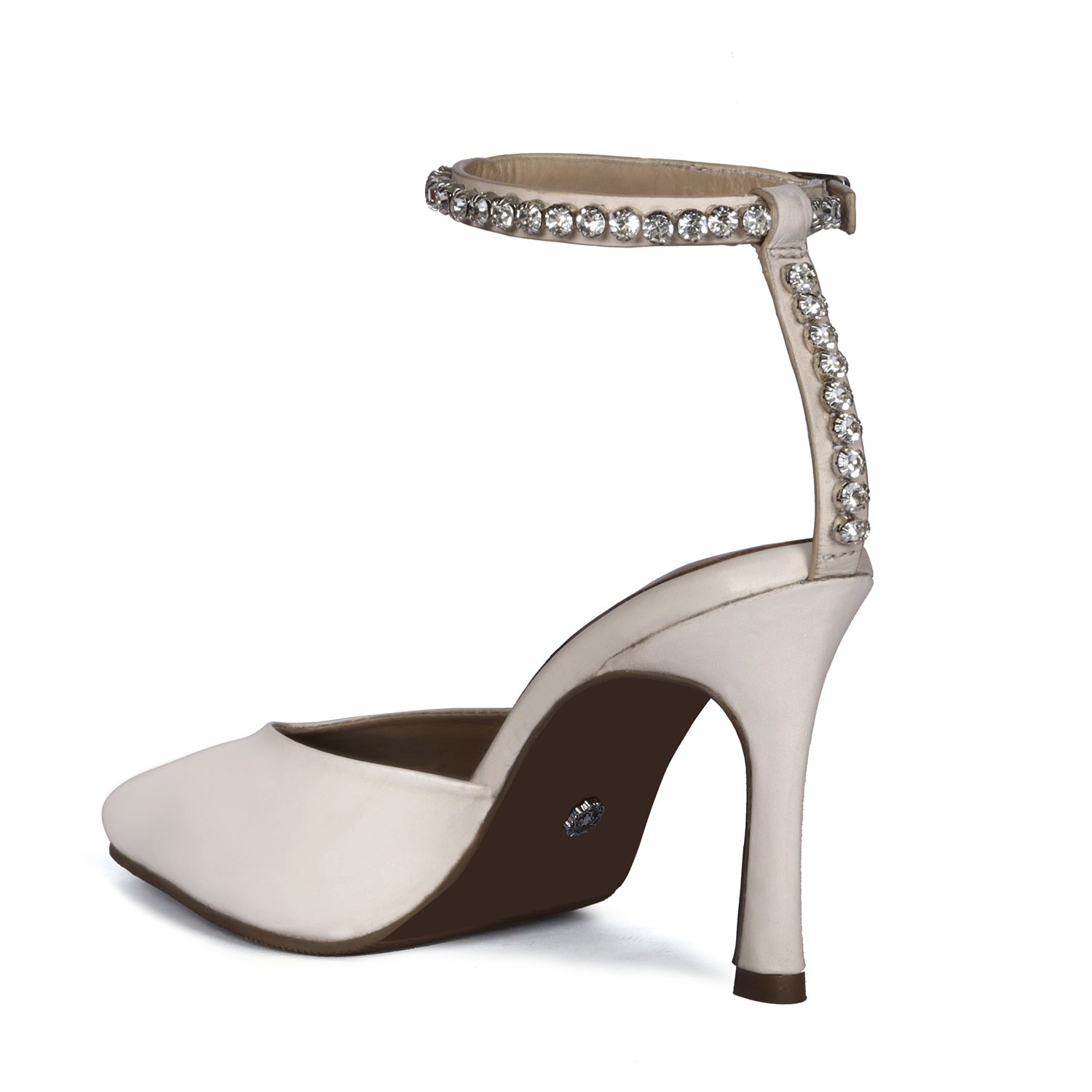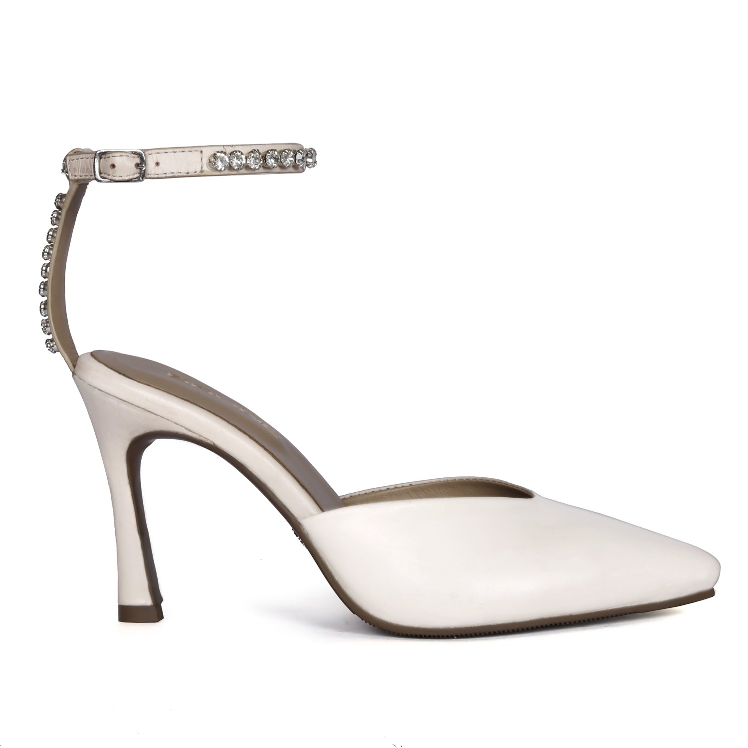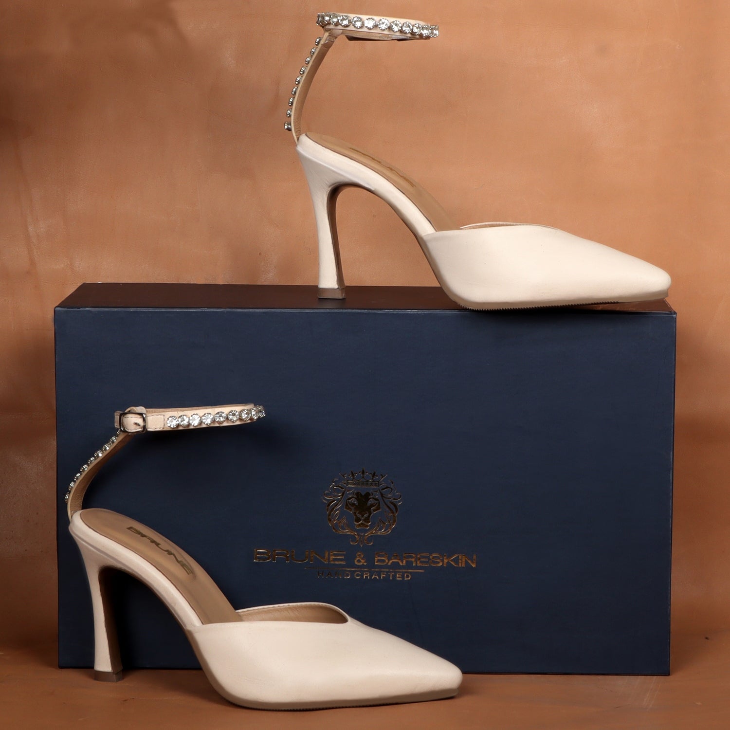 Beige Pointed Toe Heel Pumps Buckle Fastening Crystal Stone Ankle Strap Leather Ladies Partywear Footwear By Brune & Bareskin