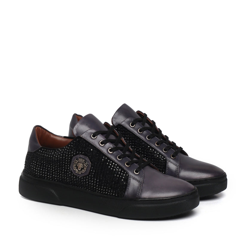 Men's Black Rhinestones black Leather Low Top Sneakers by Brune & Bareskin