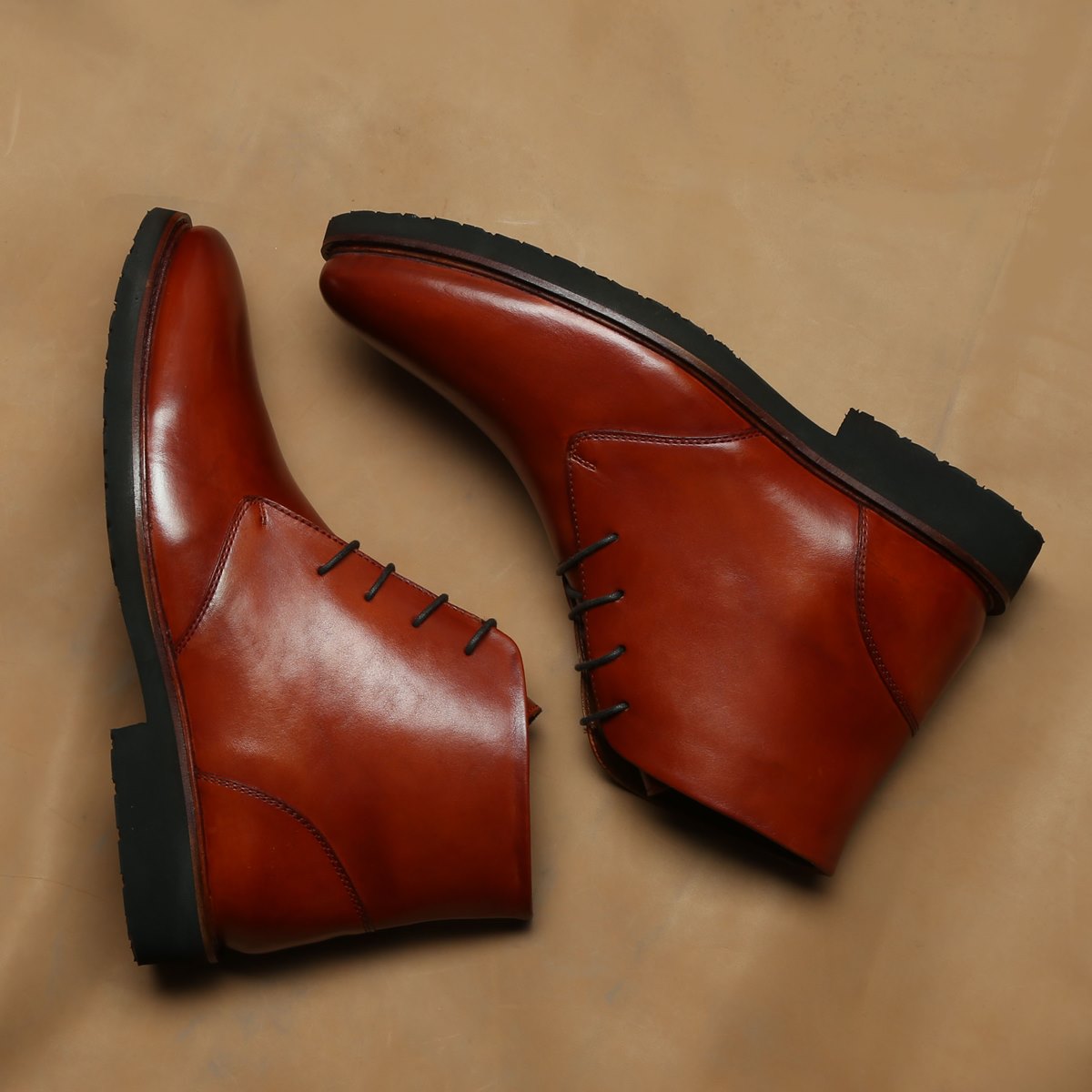 These boots are the perfect companion for adventure-loving folks. These are the formal boots with high ankle lace-up closure. The Four eyelet design makes it very easy to wear. They are perfect to team with formal trousers as they blend well with the classic fabrics as well as the modern blended synthetic fabric pants, slacks, and trousers. The fold-able high ankle length shoes are fitted shoes that emphasize the size and shape of your feet to perfection. What are you waiting for? You can click on CUSTOMIZE NOW Button (Just above the "ADD TO CART" button) & fill out the form to submit your customization requirements. Or you can reach us by Call, Email, What's App, and DM.