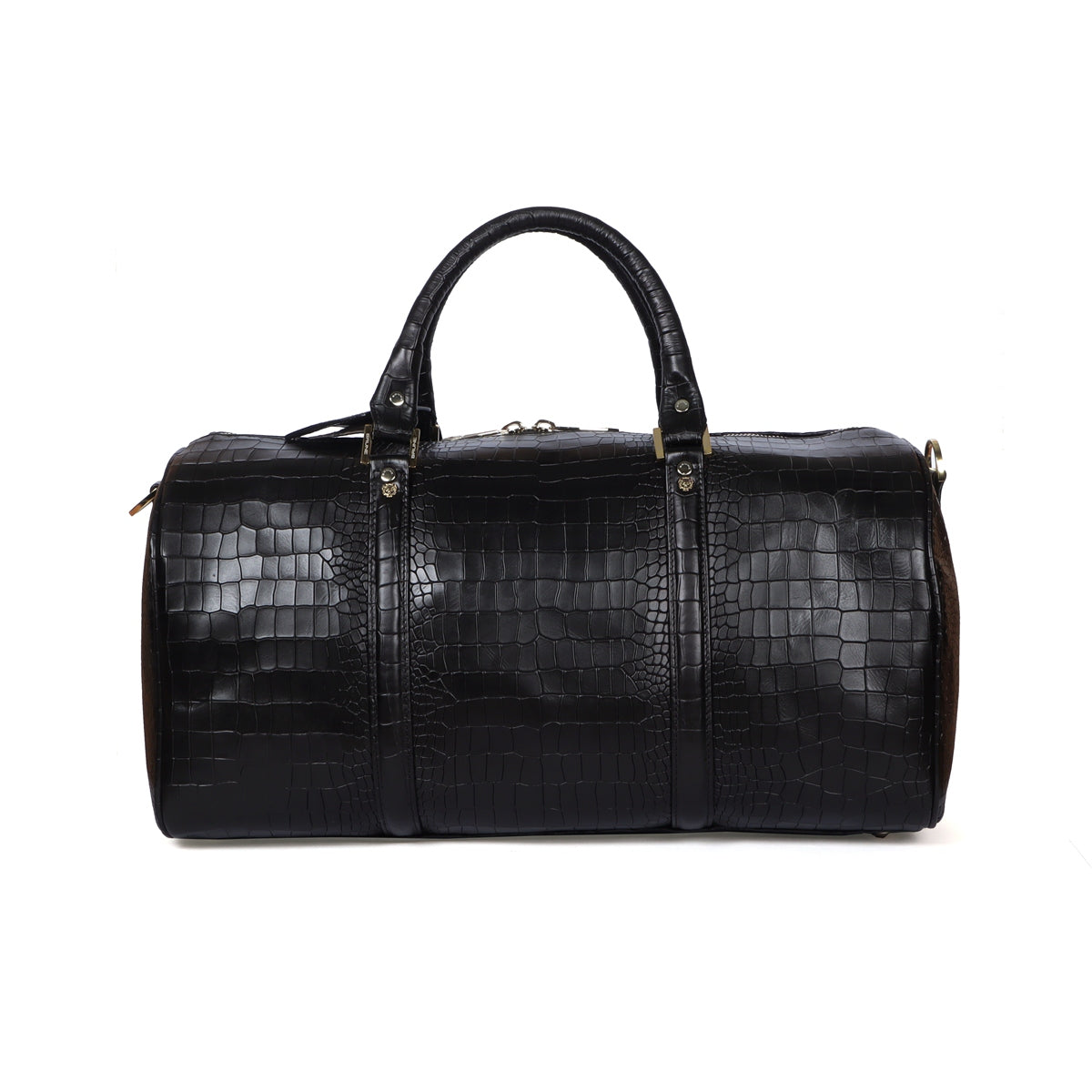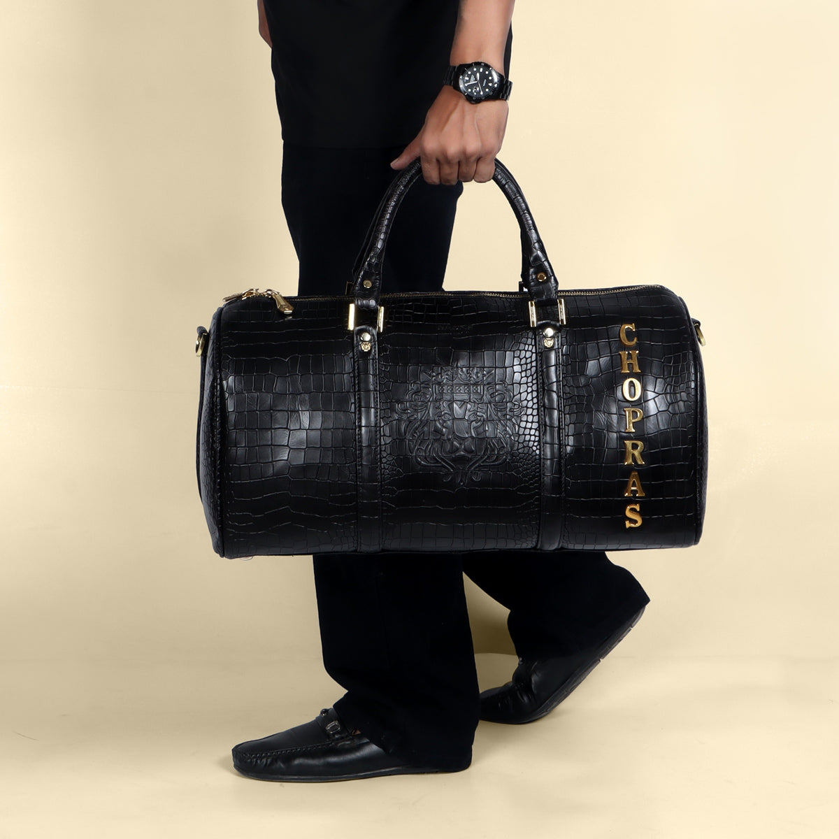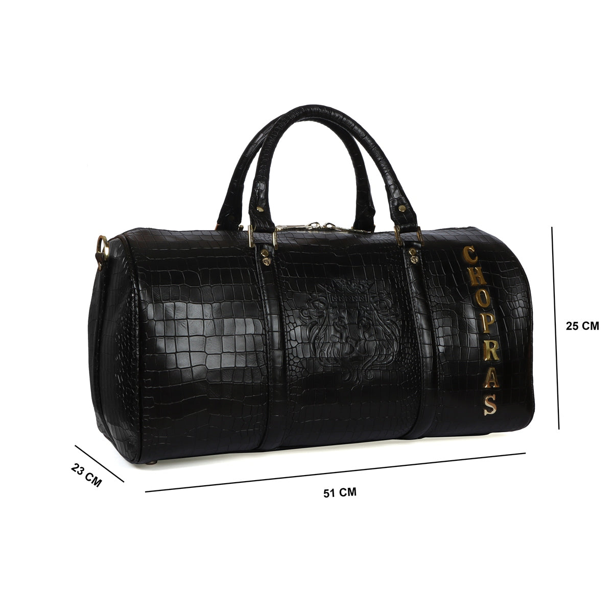 Customization plays an important role to make any product uniquely belongs to you. It is handmade duffle bag which is crafted with precisely selected highest quality Deep Cut Croco Textured Leather material. On Luxurious black Bags name will be mentioned "CHOPRAS" Initial done with gold metal on the right side of the Bag. Brune & Bareskin signature brand lion logo on front increase the style quotient of Duffle bag/ Gym bag. it features the large main compartment has the ample space to carry the clothes for a long weekend. The removable / adjustable shoulder strap provides the needed comfort while carrying it and also has a handle to carry it quickly by hands.