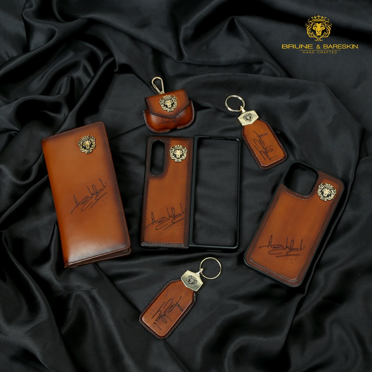 Customized This combo is perfect for the folks who love to carry the elite products. It is a must-have combo to show your class and style statement in Accessories. The Genuine Leather Wallet, Mobile Cover, Air-pod Cover, and key chain is a long-term investment. The contrasting laser Signature dignified the darker shade of Tan leather perfectly on the Combo Pack. The Scritto motif is now available on the upper of the Cursive models. First, Key-chain is a symbol of power & safety. It's a major accessory to secure your asset. Bespoke keychains with metal finishing and lion logo look so elegant. Second, the Bi-fold opening wallet features two main pockets along with a small security pocket on both sides. Third, the Air pod Carrying Case will give you the utmost classy look. Fourth, Tan Laser engraving Leather Mobile cover looks lavishing and Brune & Bareskin's signature lion logo. The subtly embossed branding makes a perfect look with the entire design language. This high-veg tan leather will surely serve you for a longer time period. You can get it customized in your favorite color shade with Name Initials with our bespoke services.