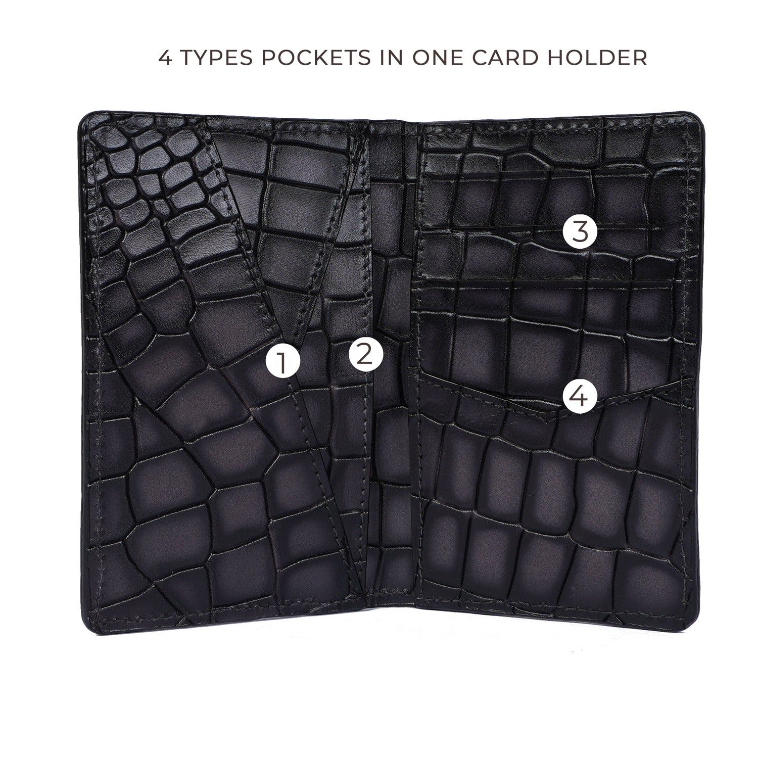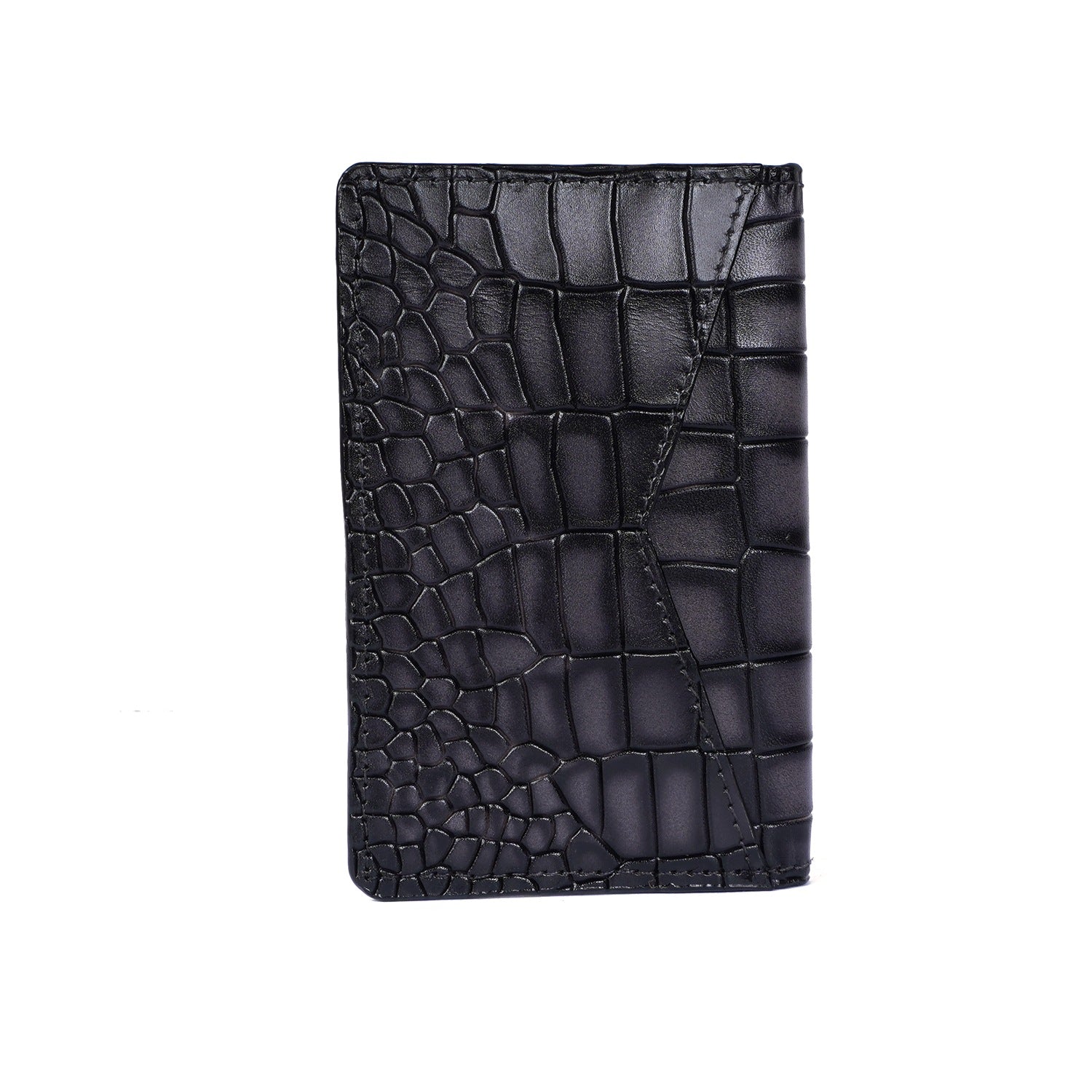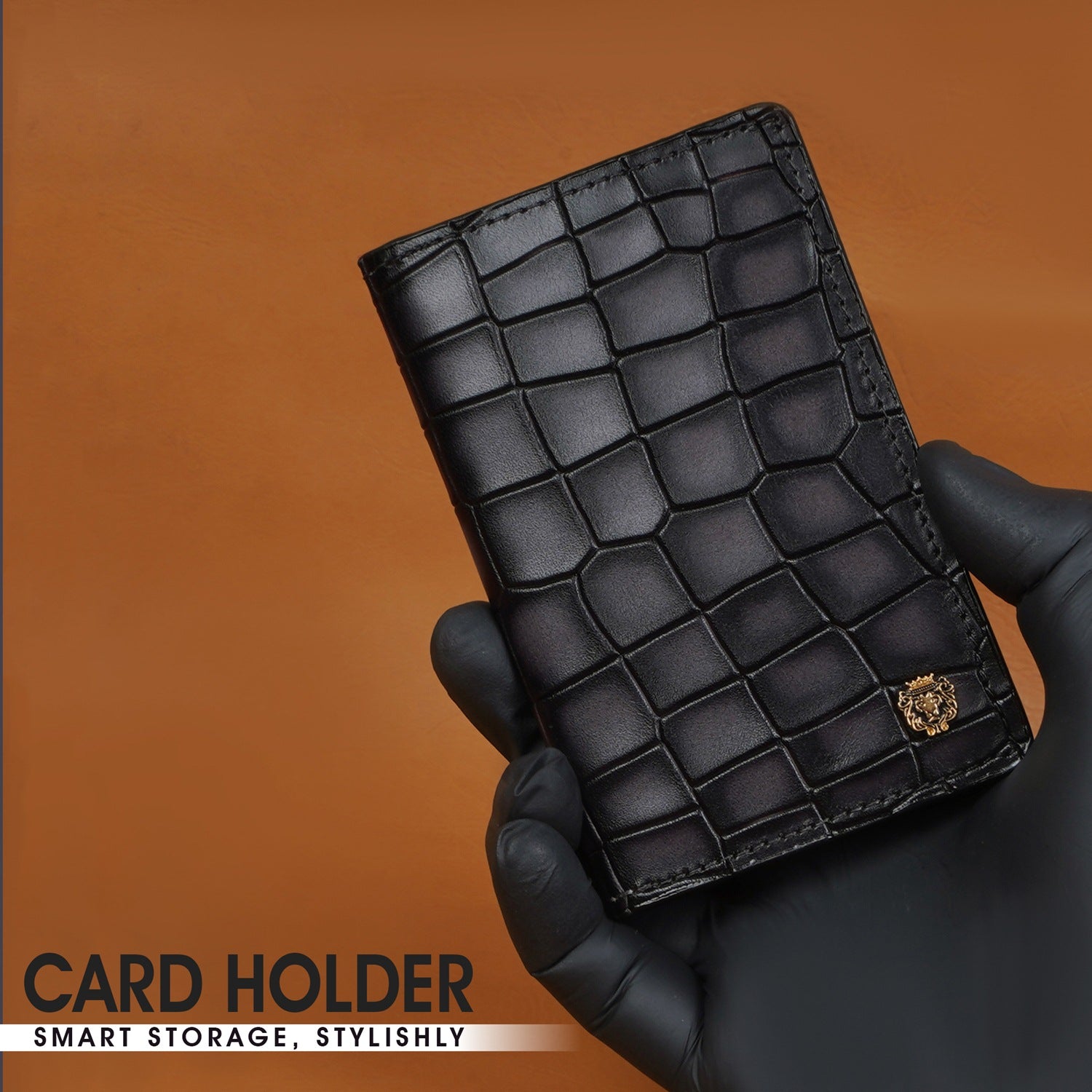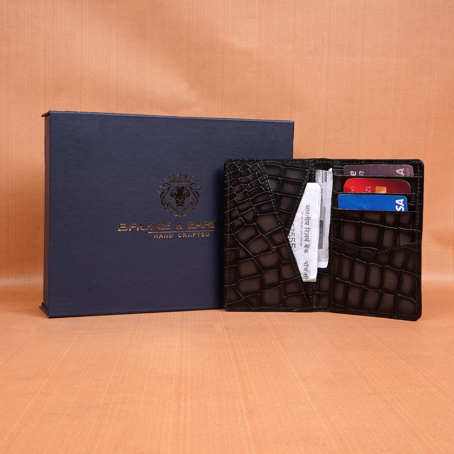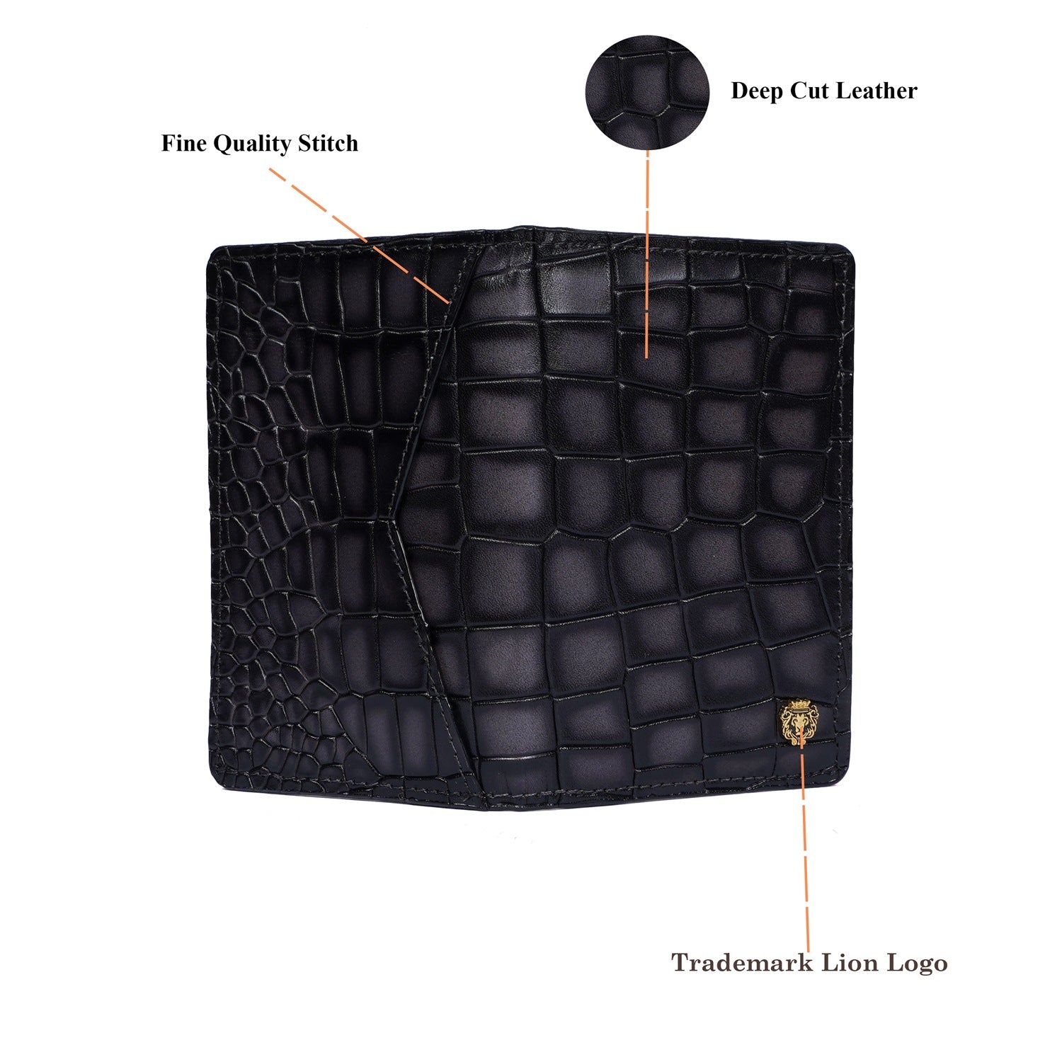 Discover the ultimate in style and functionality with the Brune & Bareskin Bi-Fold Smokey Grey Card Holder. Hand crafted with premium quality deep cut Croco textured leather, this unisex card holder boasts a unique smart design that keeps your cards organized while exuding a trendy and sophisticated look. With multiple compartments and a sleek golden finish mini metal lion logo, this card holder is perfect for staying organized on the go.