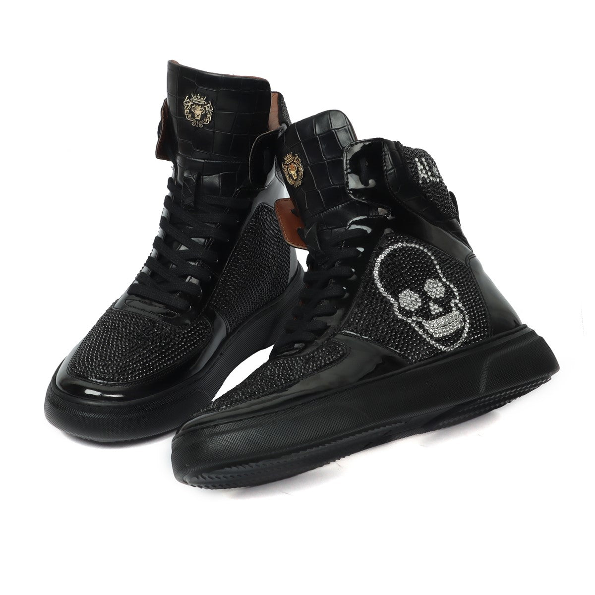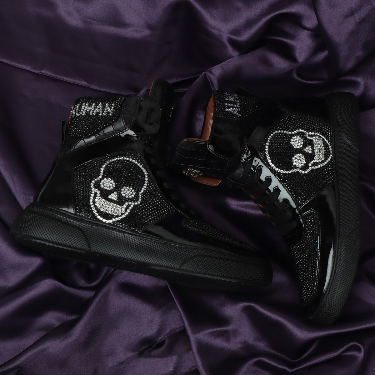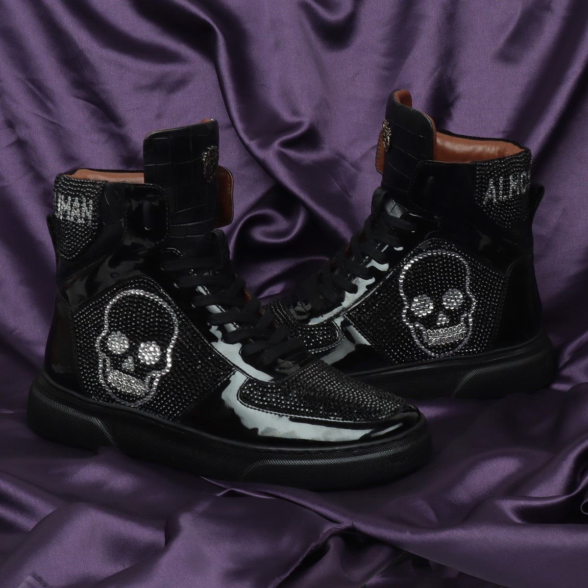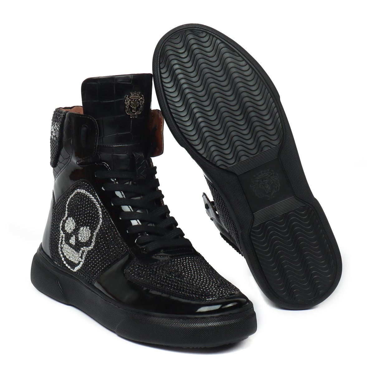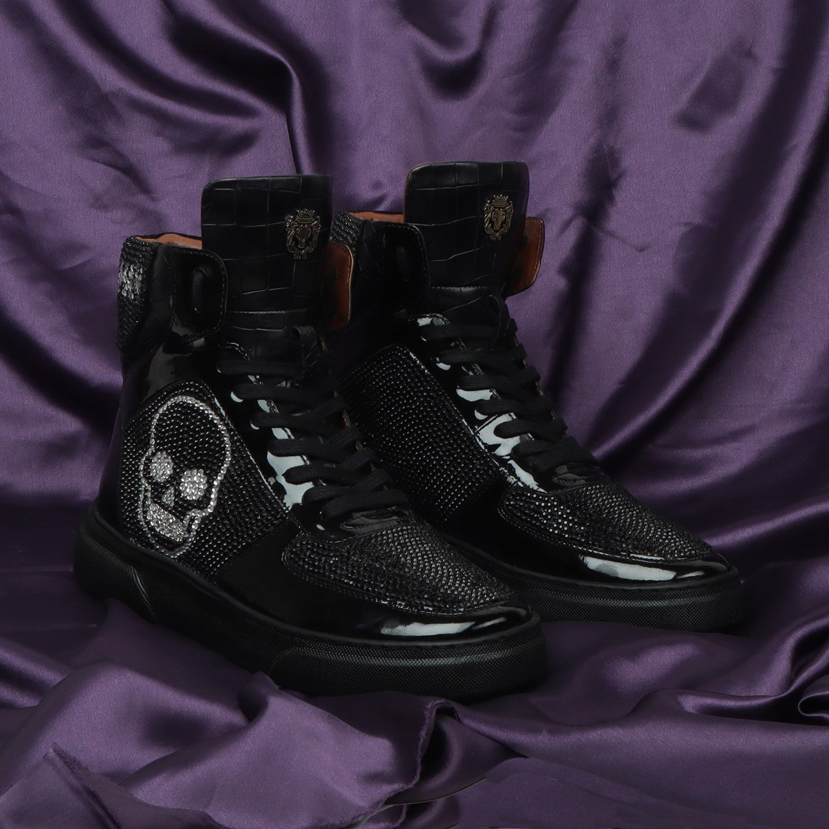 Black color is the first preference of every person. It is entirely handcrafted from precisely selected highest quality materials. The artistic finish is achieved by our artisans with hand zardosi. The special abstract silver Skull Swarovski Crystal zardosi design enhances the style quotient. The Brune & Bareskin's brand lion logo on the deep-cut Croco leather tongue of the sneaker looks very elegant. The Lace-up closure makes it very convenient to adjust the sneakers according to your feet. 100% patent leather is used for the longevity of the product. A black rubberized sole ensures a perfect grip on different terrains.